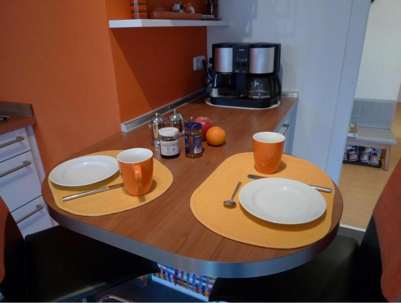 Der Tischfortsatz misst 60x88cm und ist für zwei (bis drei) genau richtig für einen Kaffe, ein kleines Frühstück und Gäste, die uns zuschauen wollen. Zwischen Tisch und Herd sind nur 55cm Platz, das ist gemütlich!