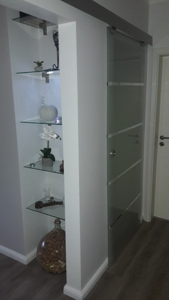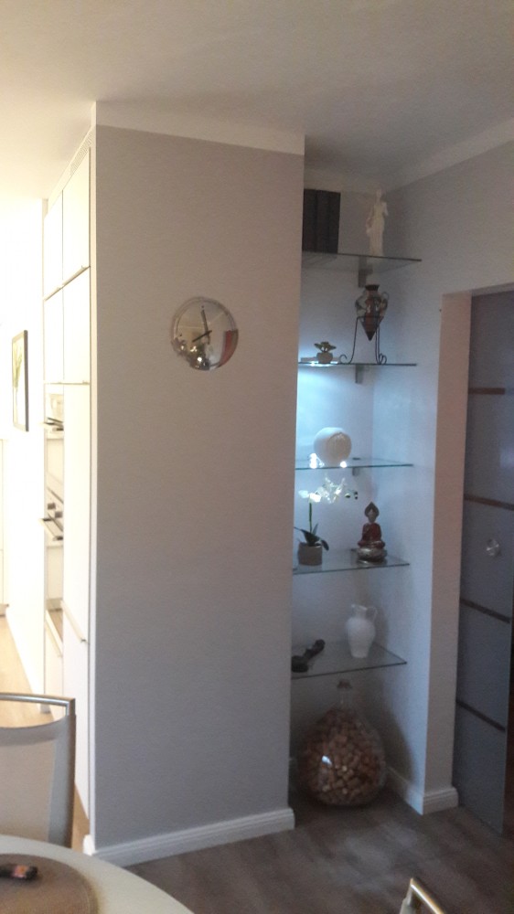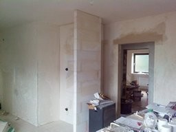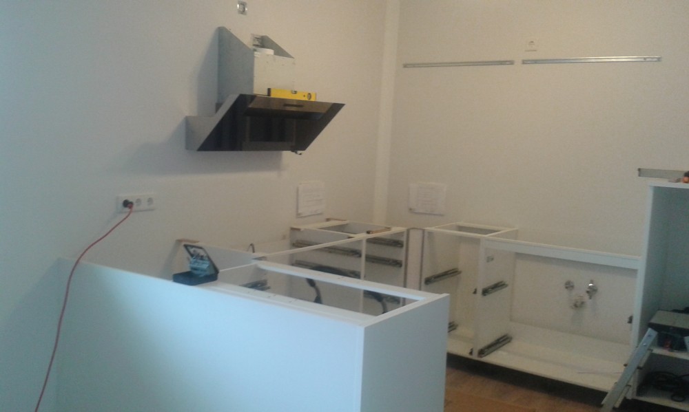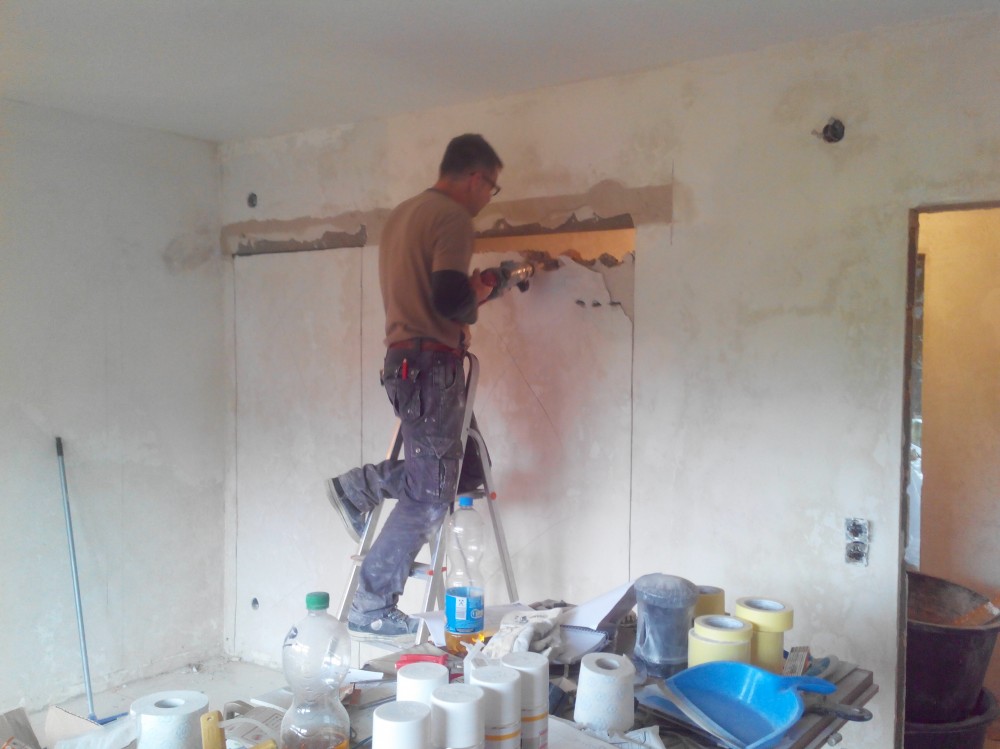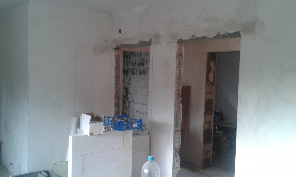 Wasser musste neu verlegt, die Tür versetzt, der Trockenbau für die Hochschränke und Nische gebaut werden. Durch den Trockbenbau entstand eine Nische für die Garderobe im Flur und Platz für ein Regal.