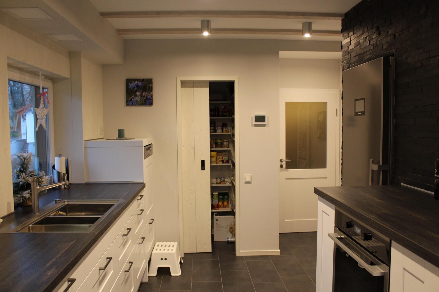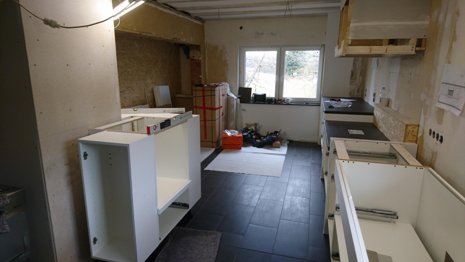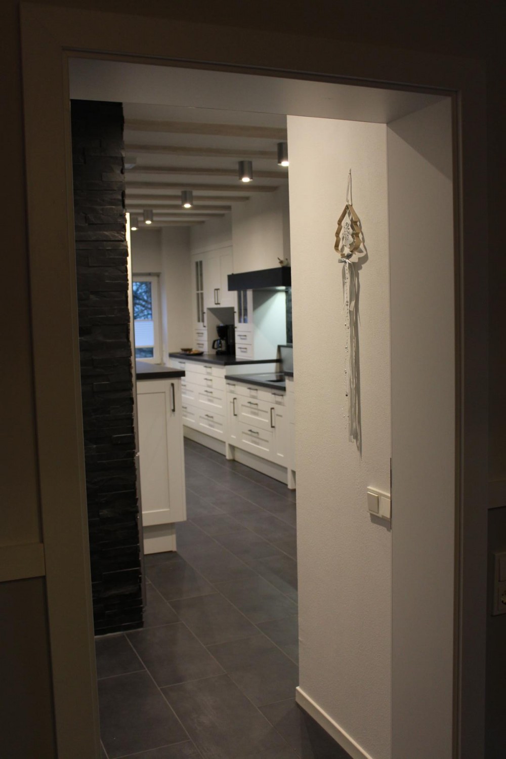 Wir haben 2015 einen Komplettumbau vom Haus beschlossen, bei dem unsere Wohnung zuletzt an der Reihe war. Also viel Planungszeit. Wir haben zwei Kinder (inzwischen 3 und 6) und wollten gern eine große Küche mit Sitzplatz und eine Speisekammer, daher kamen wir darauf, die Wand zwischen alter Küche (vorher 11qm) und Essbereich des Wohnzimmers (vorher 46,5 qm) zu entfernen. Dadurch kommt die Abendsonne von Westen in die Küche, und es gleicht aus, dass wegen der Speisekammer und dem hochgesetzten Geschirrspüler ein Teil des alten Nord-Küchenfensters zugemauert wurde. Jetzt am Ende hat die Küche ca. 23,5, die Speisekammer 1,7, und das Wohnzimmer 31,5 qm.