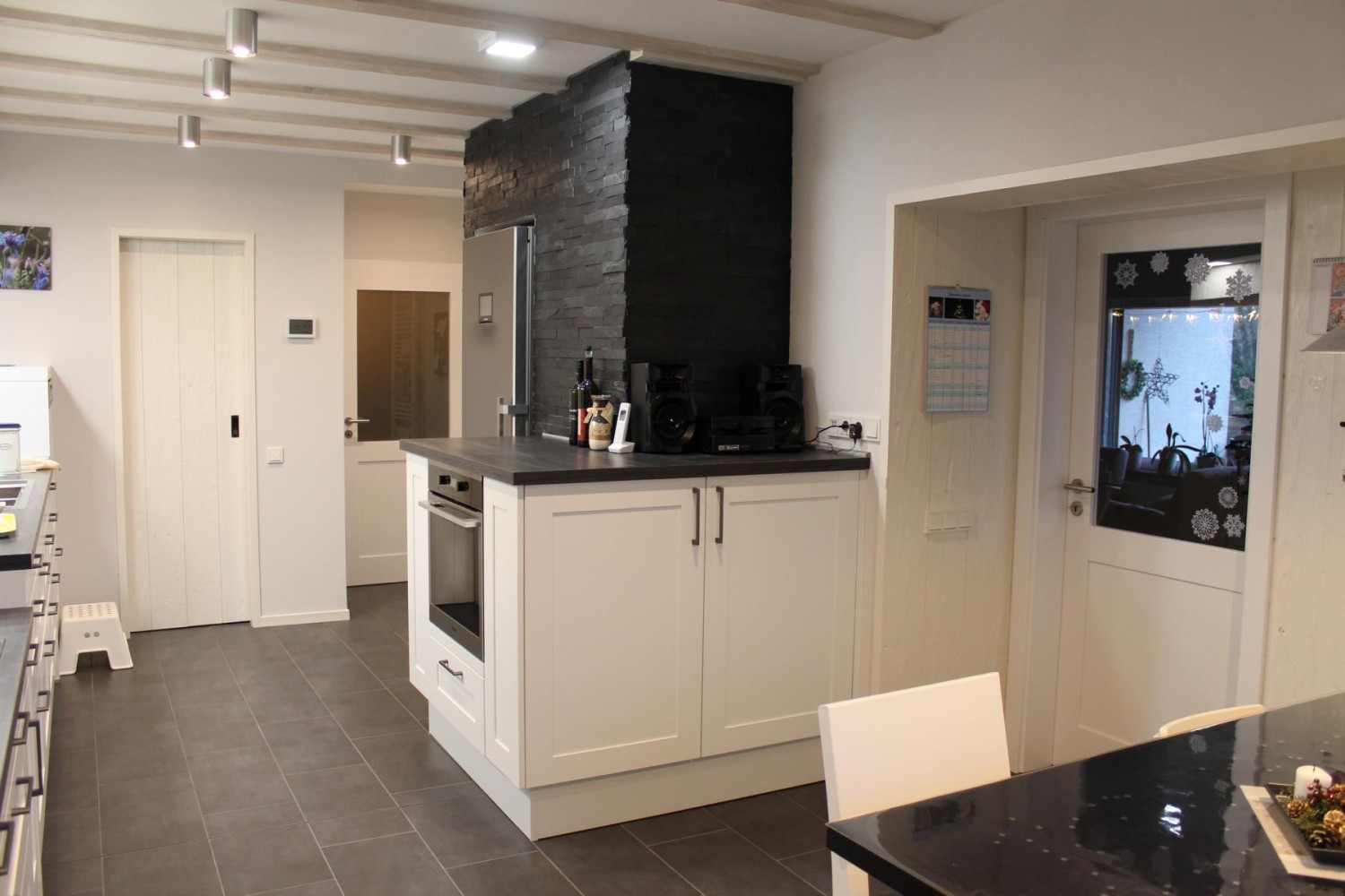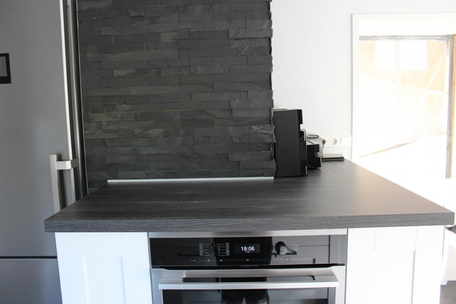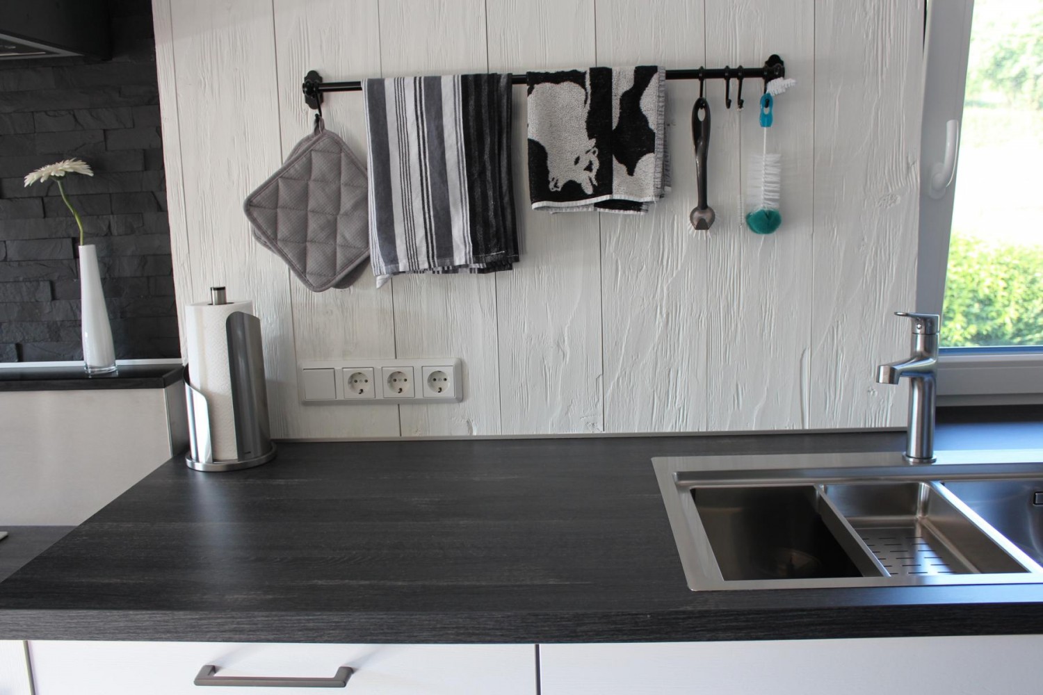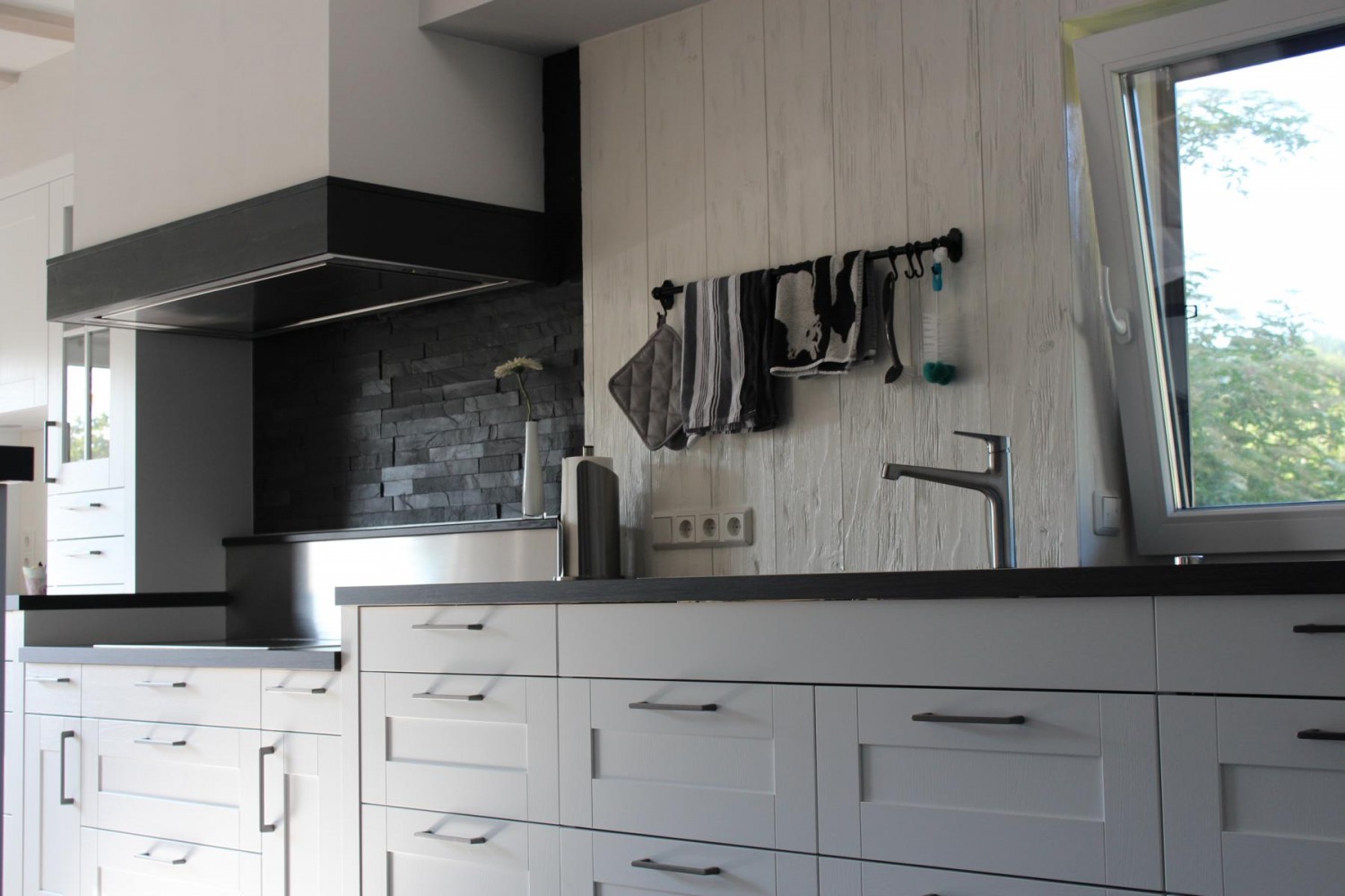 Die Holz-Rückwände und das Wandholz an der Essecke bestehen aus Mocopinus Fasebrettern mit Oberfläche "gehackt", dreifach mit weißem Lack gestrichen, eingesetzt in mitbestellte Rückwandprofile vom Küchenhersteller, damit ist der Übergang zur Arbeitsplatte gerade und dicht. Unter den Schieferverblendern sitzt als Wischleiste ein 1cm Kantenlänge Alu-Quadratröhrchen aus dem Baumarkt. Alle restlichen Wände haben Streichputz erhalten und einen ganz hellgrauen Anstrich.