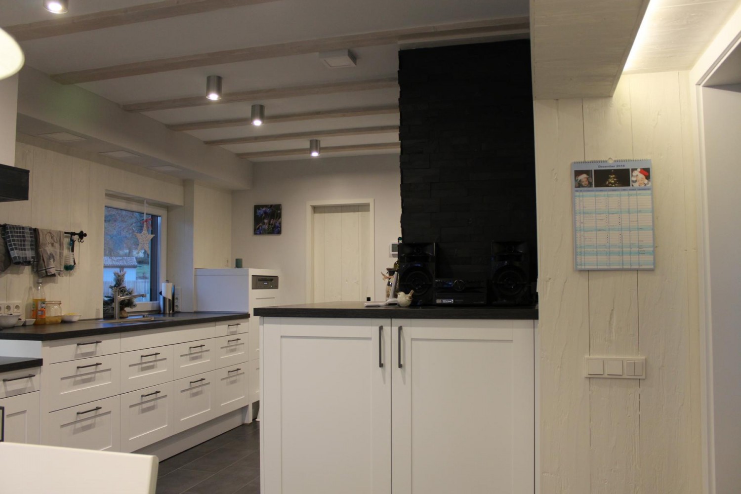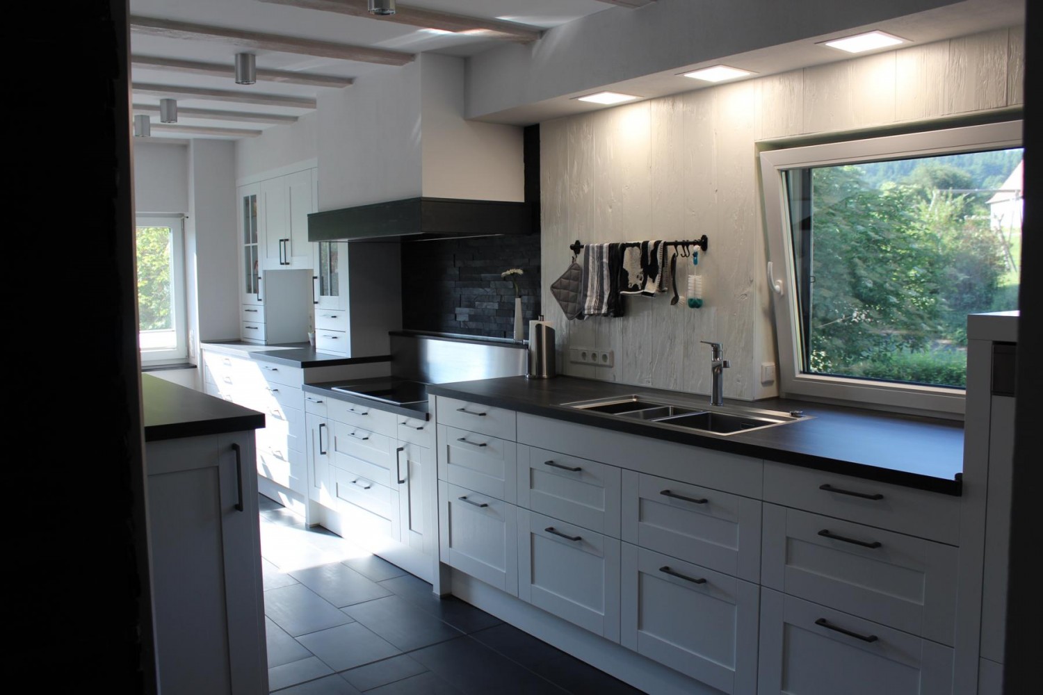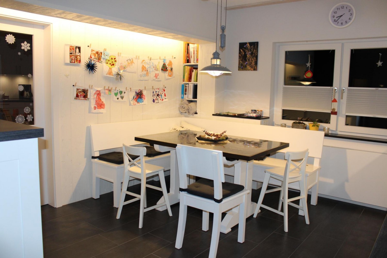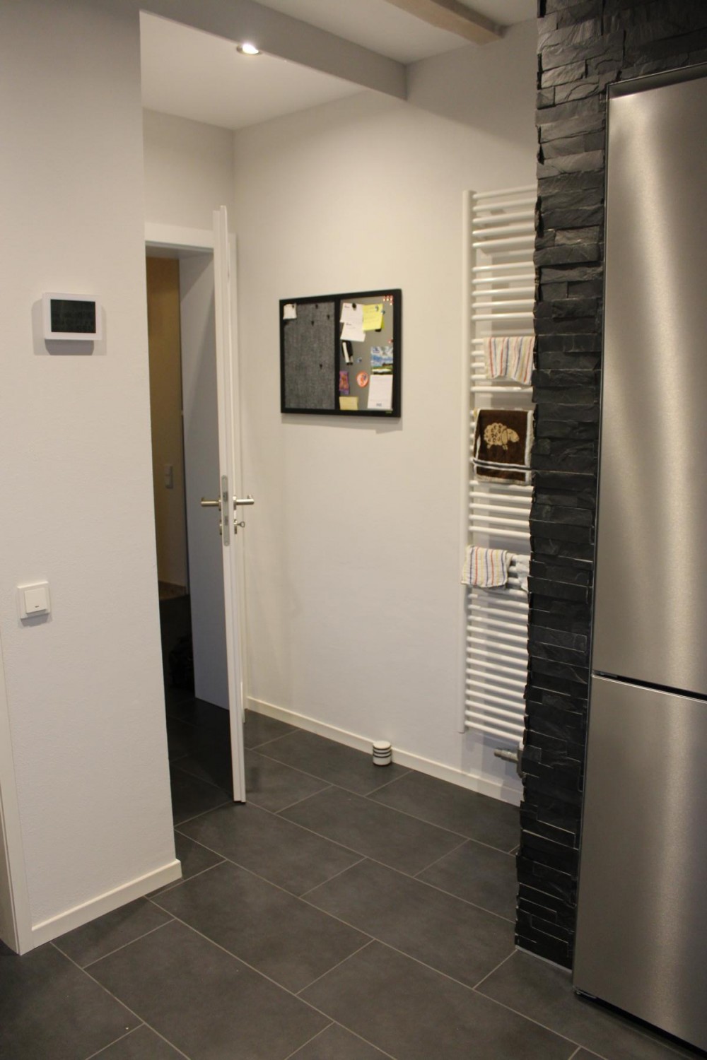 Die Holz-Rückwände und das Wandholz an der Essecke bestehen aus Mocopinus Fasebrettern mit Oberfläche "gehackt", dreifach mit weißem Lack gestrichen, eingesetzt in mitbestellte Rückwandprofile vom Küchenhersteller, damit ist der Übergang zur Arbeitsplatte gerade und dicht. Unter den Schieferverblendern sitzt als Wischleiste ein 1cm Kantenlänge Alu-Quadratröhrchen aus dem Baumarkt. Alle restlichen Wände haben Streichputz erhalten und einen ganz hellgrauen Anstrich.
