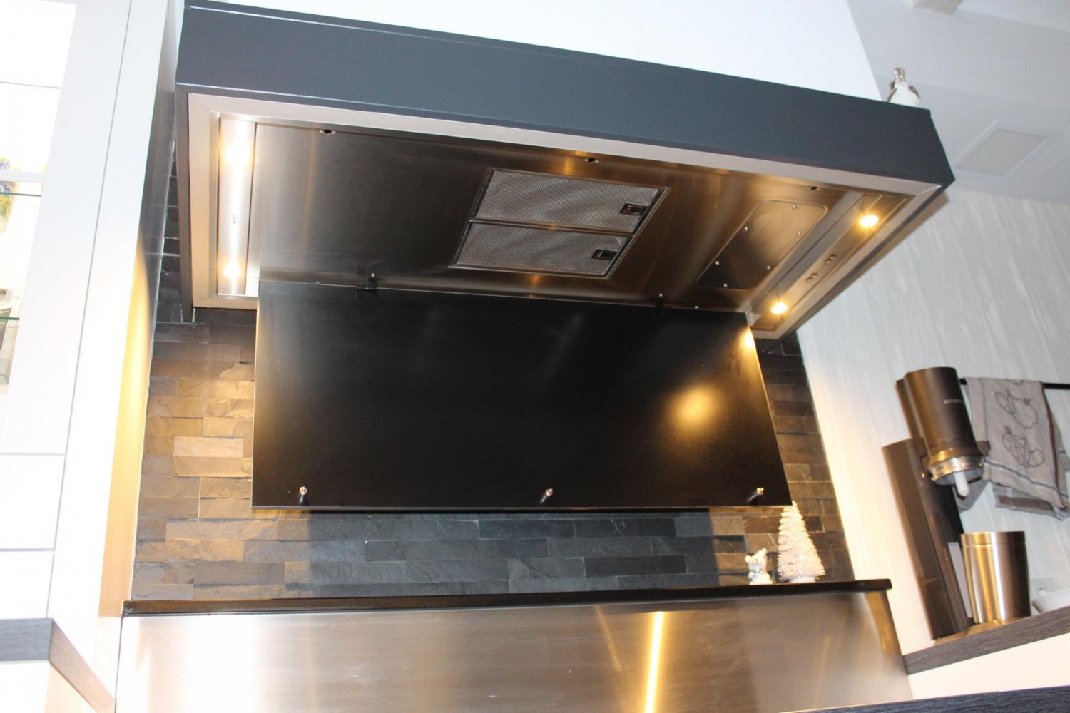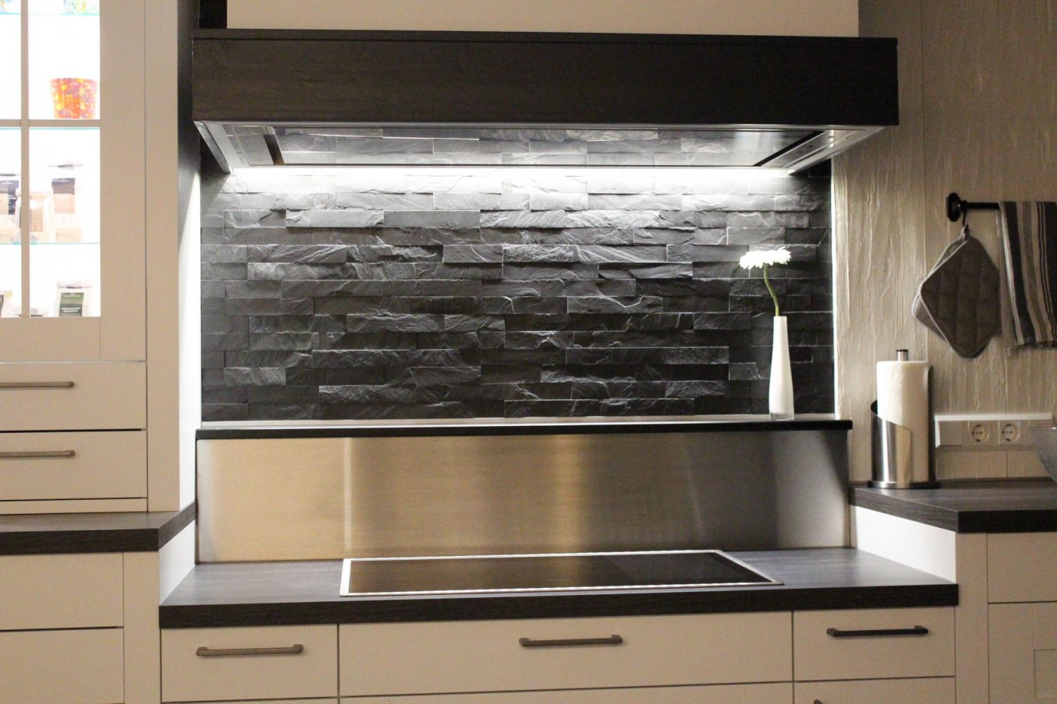 Die Tiefe der langen Zeile ist 70 cm, am Kochfeld 60, hier ist die Differenz die etwa 25cm hohe Ablage dahinter. Das funktioniert gut mit dem Edelstahlblech (40 Euro beim Metallbauer des Vertrauens), der Schiefer darüber ist imprägniert, aber kriegt so gut wie keine Spritzer ab. Oben hinten zwischen Dunstkoffer und Schiefer haben wir noch ein verdecktes, schaltergesteuertes LED-Lichtband, weil die Novy wegen des Kaminofens im Wohnzimmer nur bei gekipptem Fenster funktioniert. (Die liebe ich sehr, Leistung ist 1a, sehr leise, man kann anbraten und riecht es nur direkt am Kochfeld, das Licht ist schön hell, und was für ein Luxus dass sie einem sagt wann die Filter voll sind!)