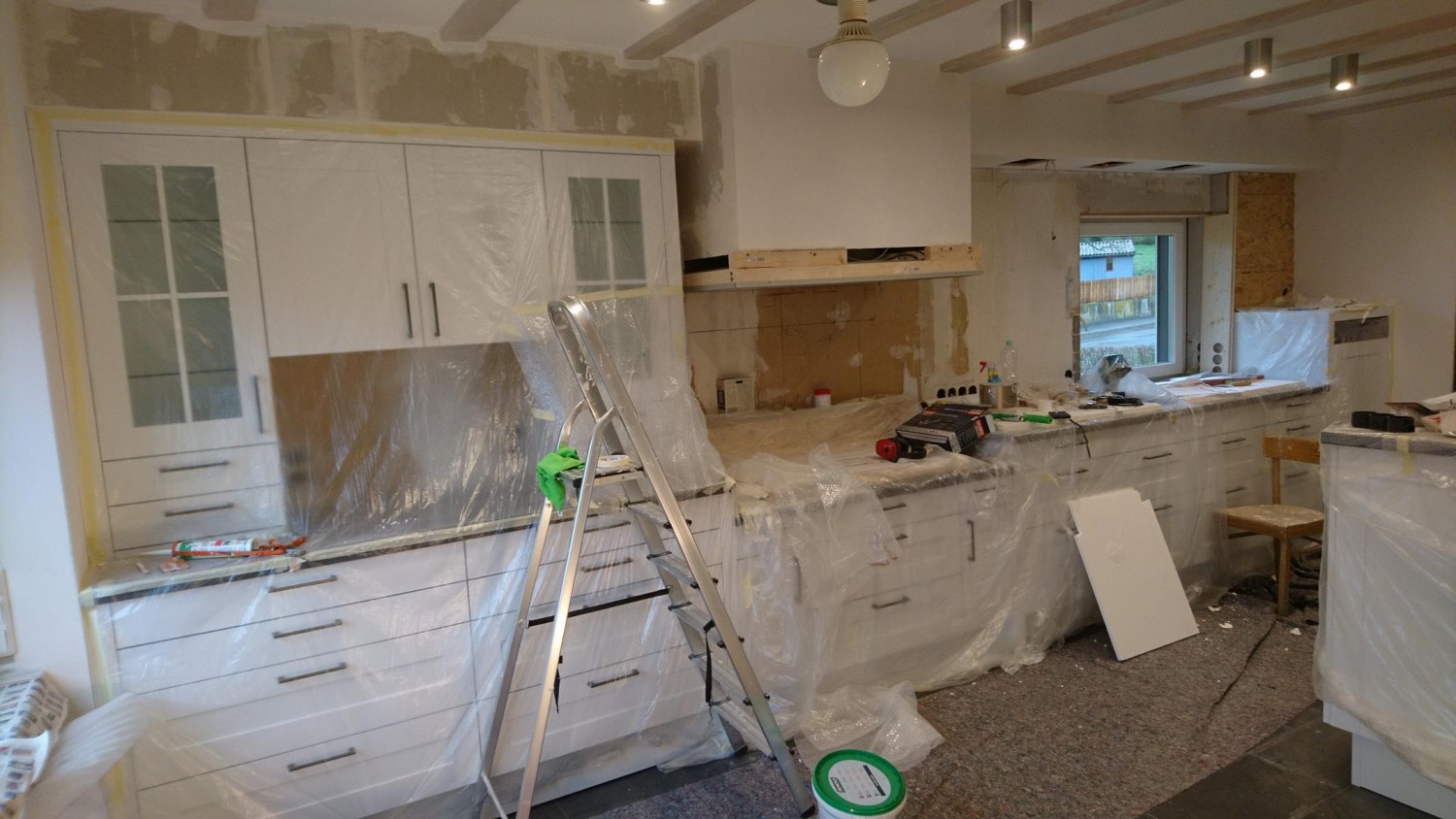 Eigentlich nur Kleinzeug: Im Buffetbereich (Aufsatzvitrinen) haben wir den Empfänger für die Fernbedienung oben auf dem Schrank mit verkastet und er spricht nicht an, d.h. Lichtfarbe ändern und dimmen geht nicht mehr, Trottel wir. Naja, an/aus geht per Schalter, und wenn wieder Zeit für Sperenzchen ist, bauen wir irgendwann mal eine Revisionsklappe. Und der Wandbereich rechts neben dem GSP - der Mann ist nun mal Graf Klecks ... es klappt nicht dass er sie einräumt ohne mit Resten zu traddeln. Ich muss nachstreichen und habe schon eine Schutzfolie.