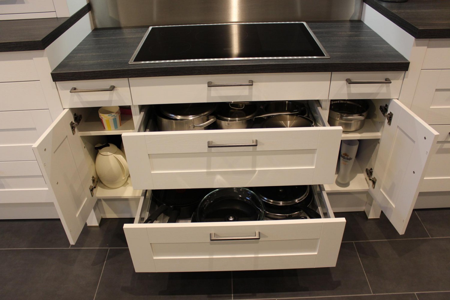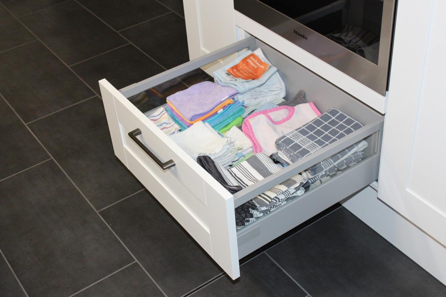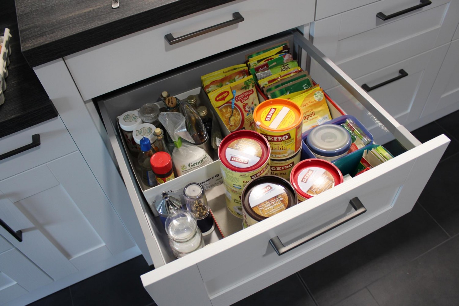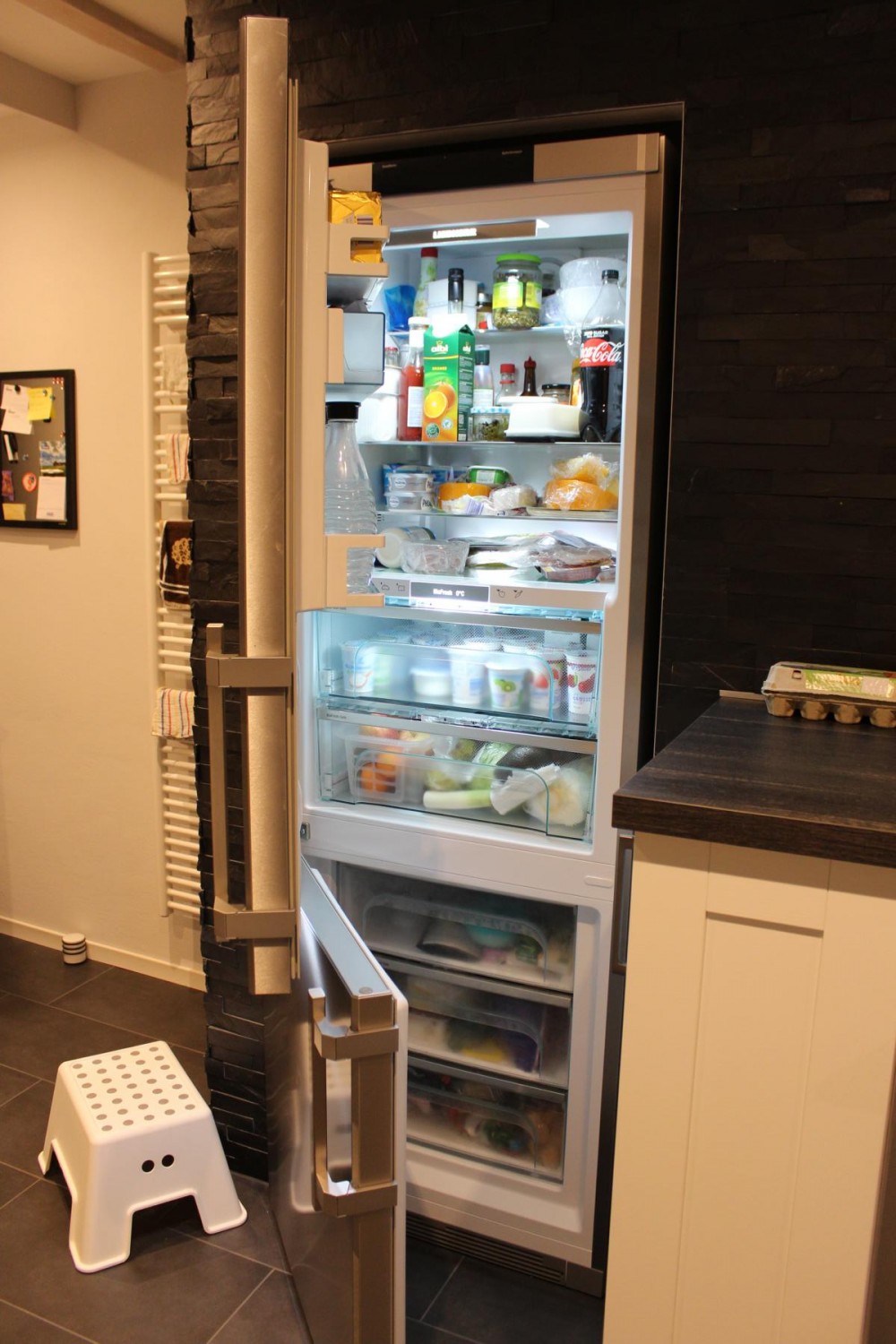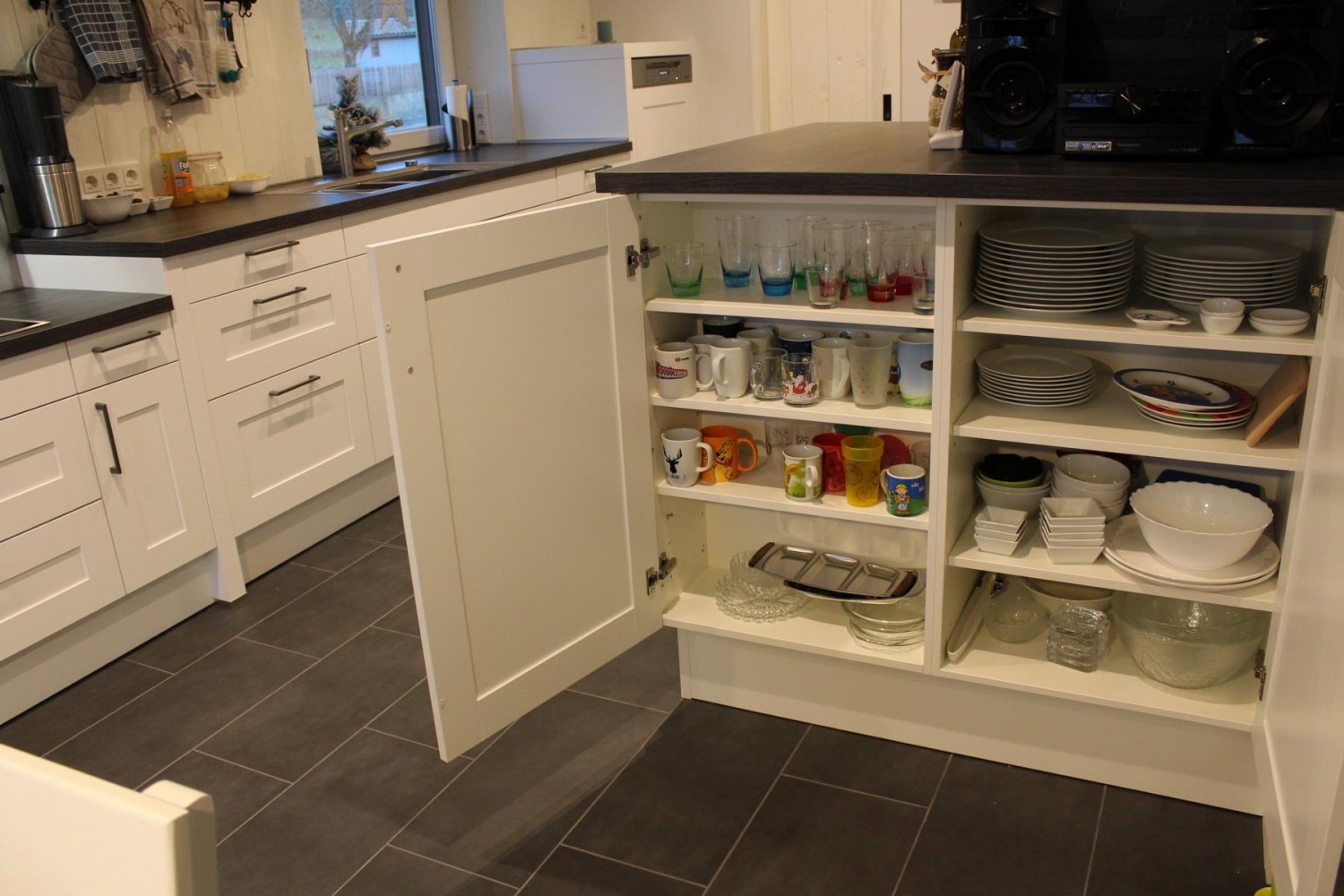Und es funktioniert auch alles wo es Bedenken gab. An den Kühlschrank kommt man gut dran, rechts daneben auf dem Herdblock legt man Kühlschranksachen ab, es hat sich noch keiner irgendwo gestoßen, auch nicht am Dunstkasten, da finde ich die Höhe total gut, weil man auch zum Reinigen ohne Probleme aus dem Stand überall hinkommt.