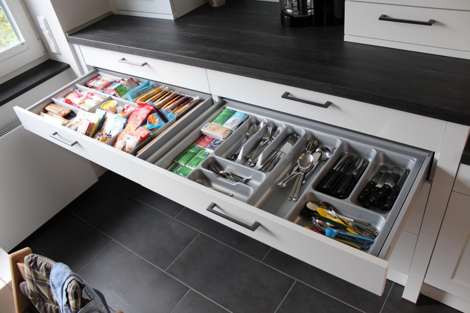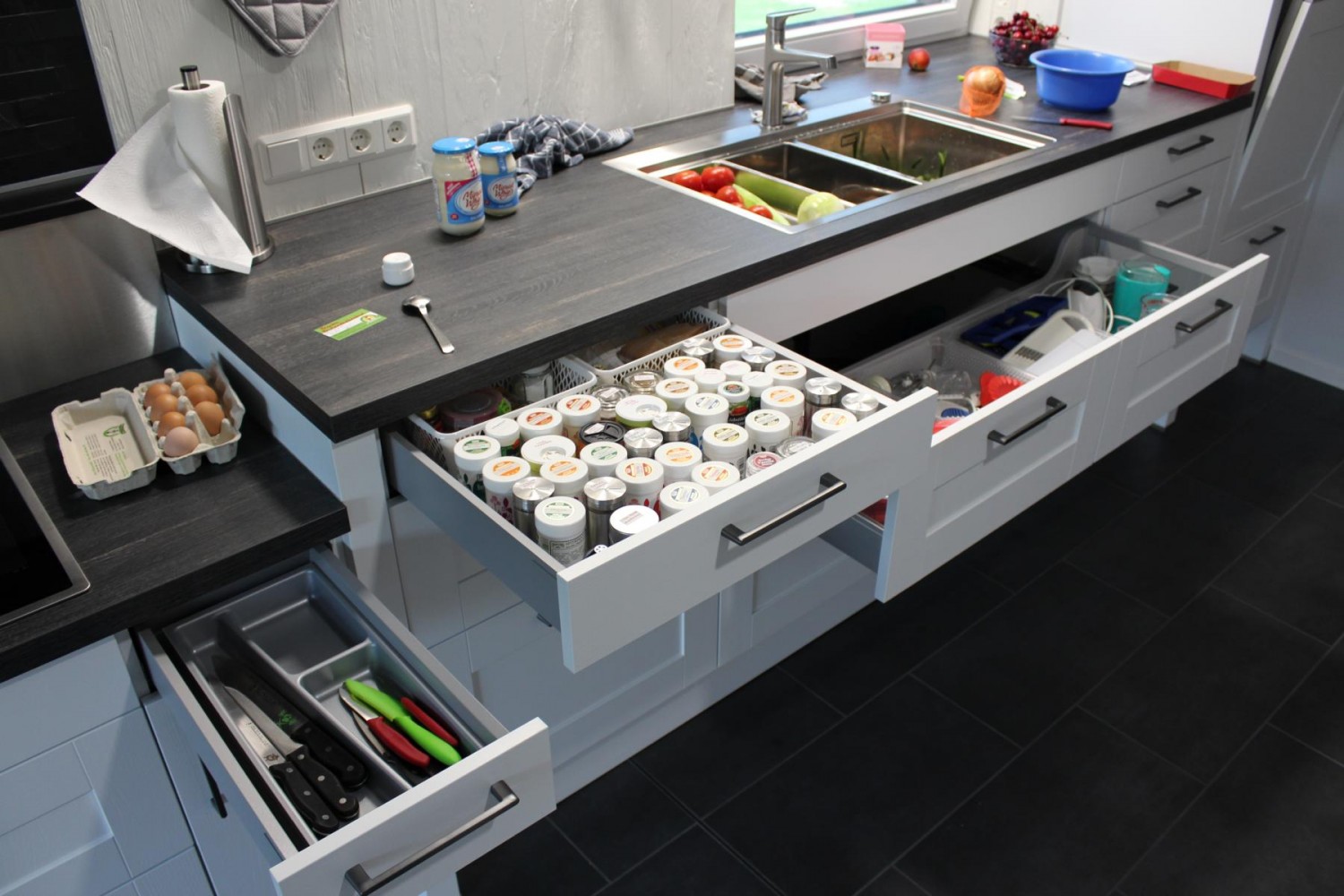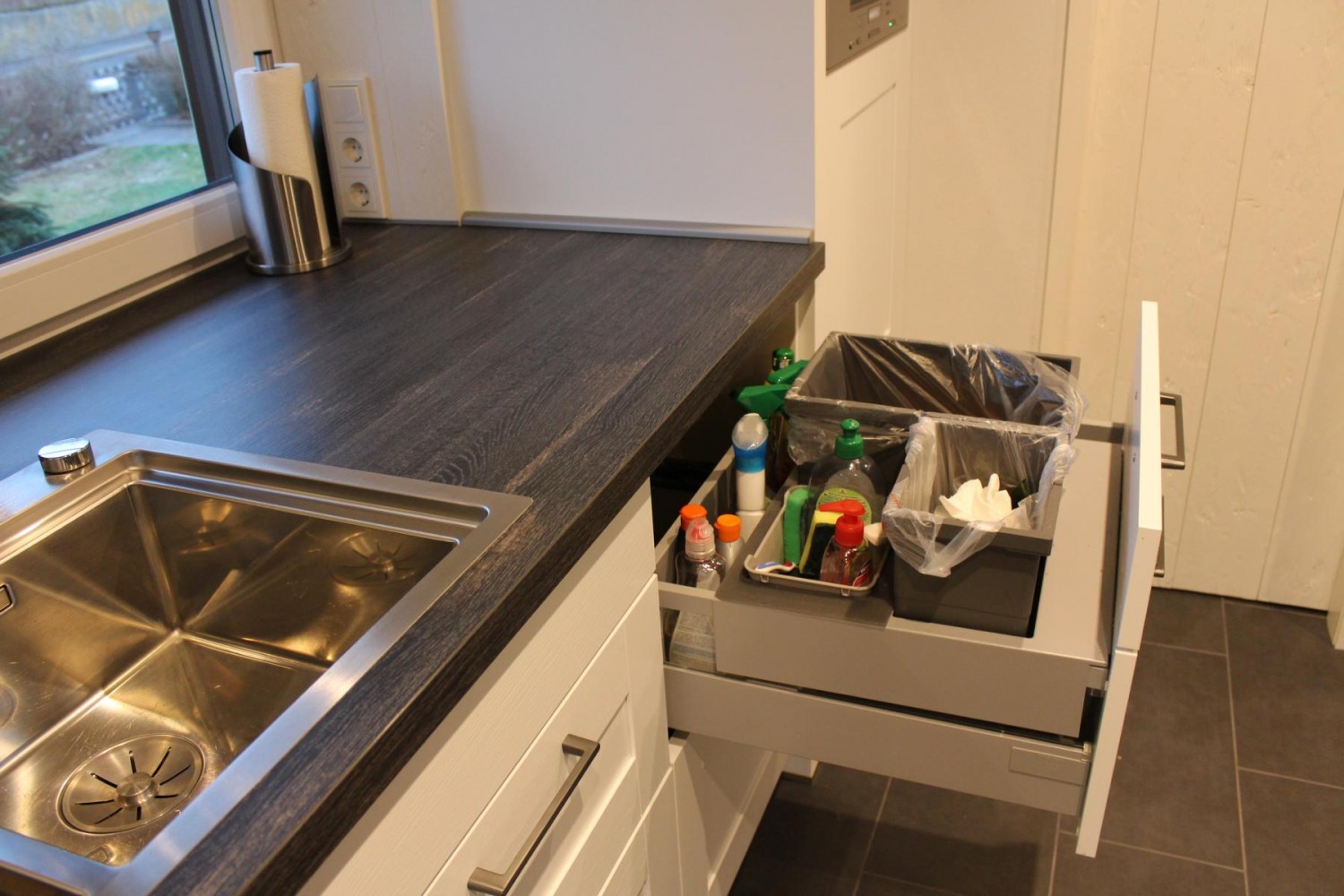 Bei der Spüle (Blanco Divon II 8-IF) war es goldrichtig auf die Abtropfe zu verzichten, die wäre inzwischen total zerkratzt. Ich habe diese System-Schale aus Edelstahl dazugekauft und ein doppelseitiges Abtropfbrett (Joseph Joseph "Flip"), das lässt sich in beide Richtungen alles sehr vielfältig kombinieren und man kann auch mal ein Becken ganz zudecken und als Abtropfe bzw. Abstellfläche verwenden - wobei wir doch den überwiegenden Normalbetrieb wie vorher vermutet so haben, dass das rechte Becken das Schäl-, Abschütt- und Kleckerbecken ist und das linke für die "sauberen" Sachen wie Abwaschen, Wasser zapfen usw. verwendet wird. Wir arbeiten von rechts nach links, bzw. beim Aufräumen und Reinigen vom Tisch ausgehend wieder anders herum. MUPL zwischen Spüle und Geschirrspüler sitzt also auch ganz praktisch, erst kommen Packungen und Schalen rein, später die Essensreste. Das Gestell habe ich nochmal ausgebaut und gedreht, weil der kleinere Restmüll näher an die Spüle sollte, sowie einen Spülmittel/Schwämmchen-Einsatz in das nicht benötigte dritte Müllbehälterloch eingebaut (das Müllelement war beim Spülenschrank dabei und ging nicht rauszurechnen, also haben wir es genommen).