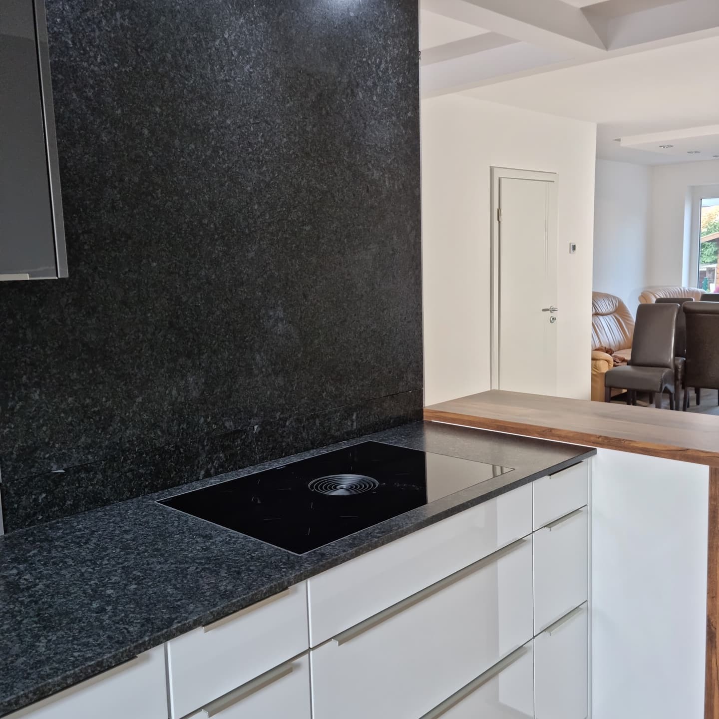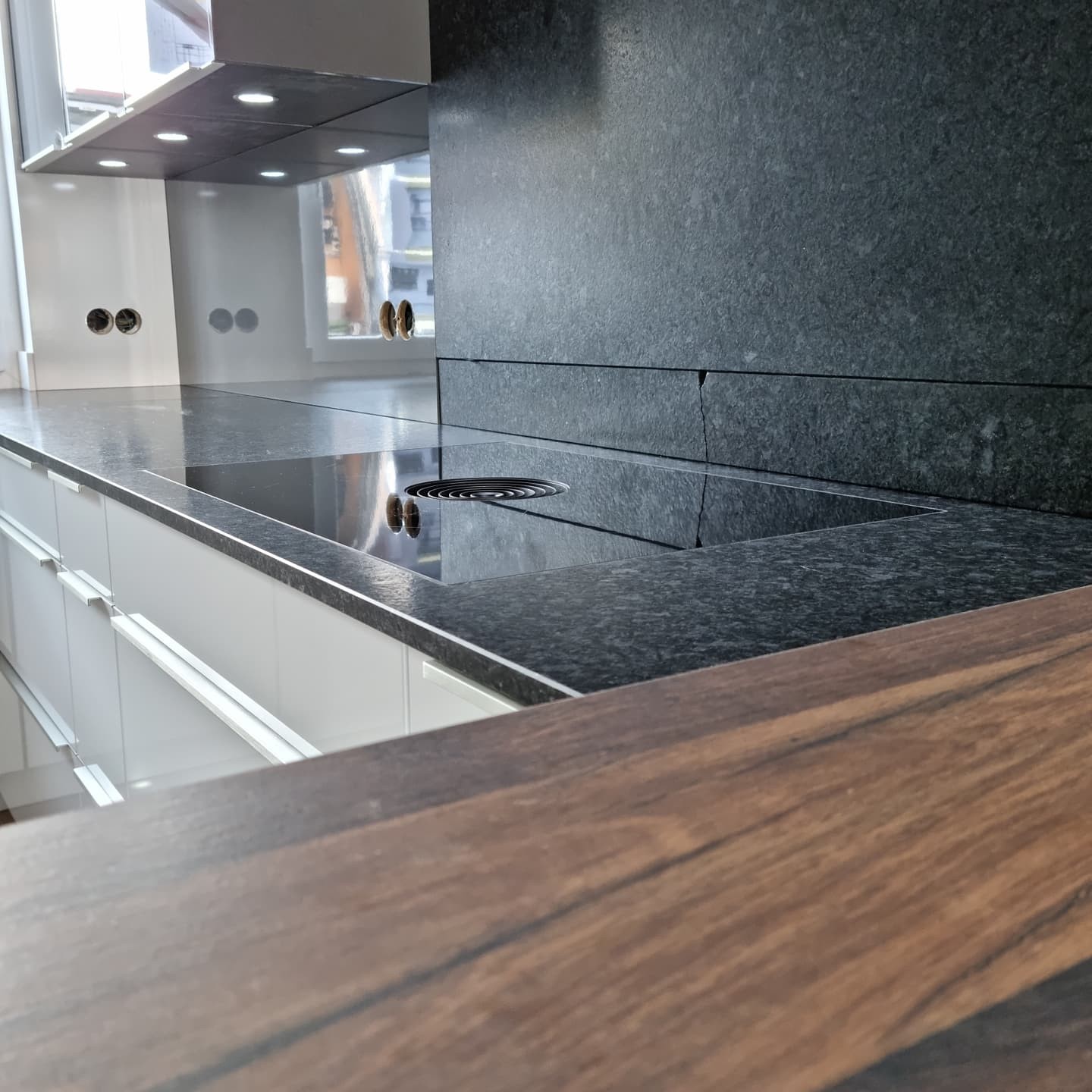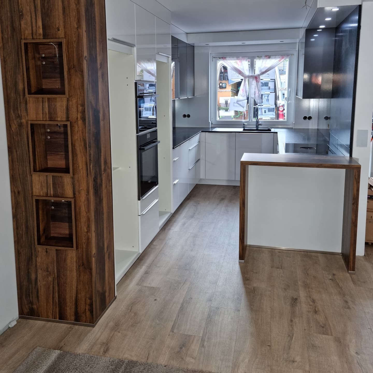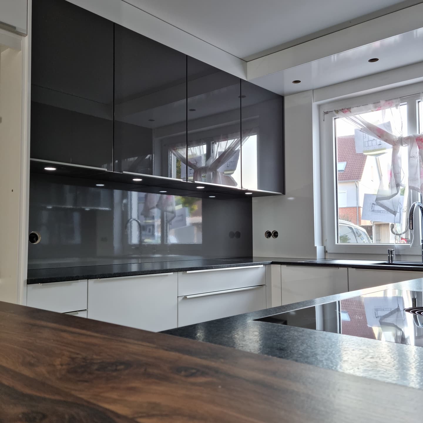 Ich bin etwas perplex, kein Erfahrungsbericht, keine Erklärungen zur Planung, zu den Geräten, eine gebrochene Wandleiste, kein Grundrissbild, viele Materialien und kein Text. Ist die Armatur ein Vorfenstermodell? Warum ist die „Theke“ geringfügig höher als die Arbeitsplatte? Was ist hinter der durchgehenden US-Front in der Zeile gegenüber der Kochfeldzeile?