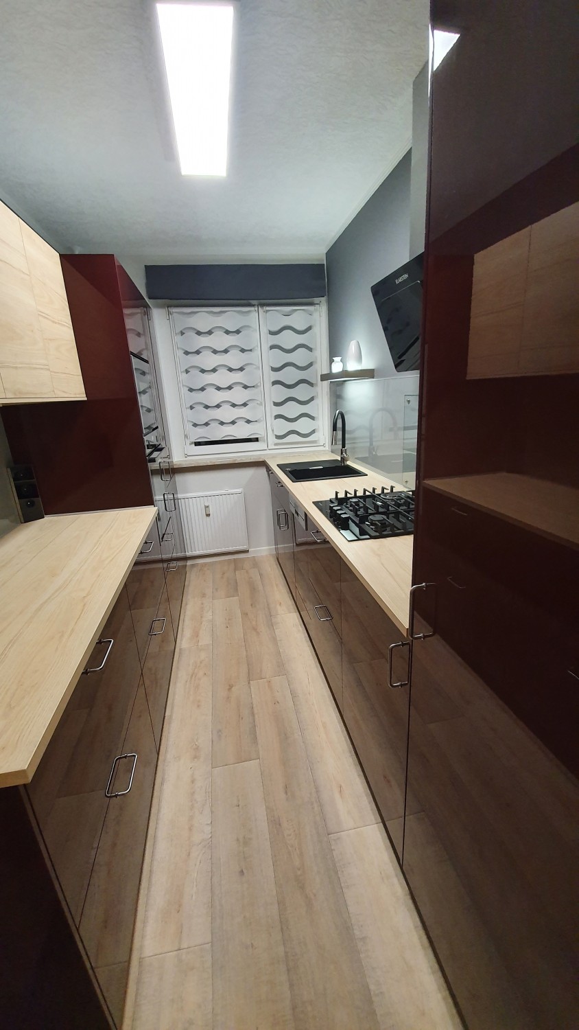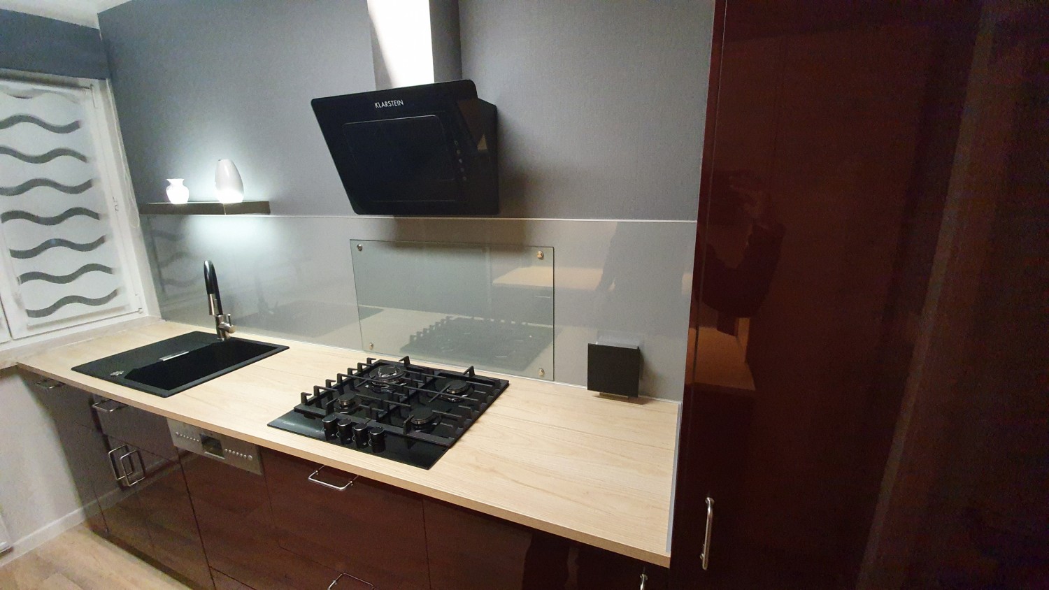Wir wohnen in einem DDR Plattenbau zur Miete mit leider sehr schmaler Küche. Deshalb haben wir uns für viele Elemente in Hochglanz entschieden, das lässt den Raum optisch größer wirken. Weiß als Farbe kam für uns auch nicht so in Frage, wir lieben Farben und wollen auch nicht immer das, was jeder so hat 😄