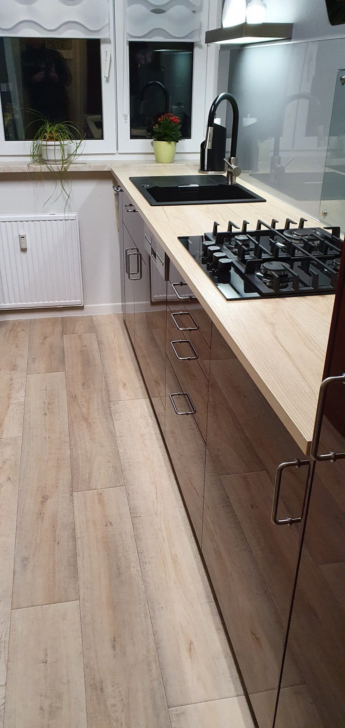 Gratuliere dir zu deiner neuen Küche!! Die Farbauswahl mit dem Holz und dem Fußboden gefällt mir sehr gut 👍 Sicher hast du auch sehr viel Stauraum. Darf ich fragen wie lang und breit dein Raum ist bzw. wie viel Abstand zwischen den beiden Zeilen ist?