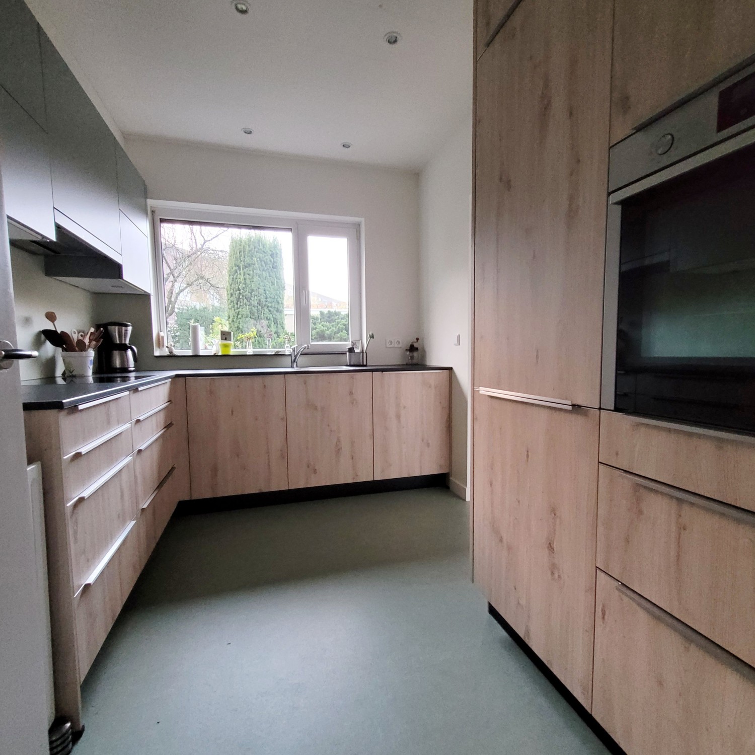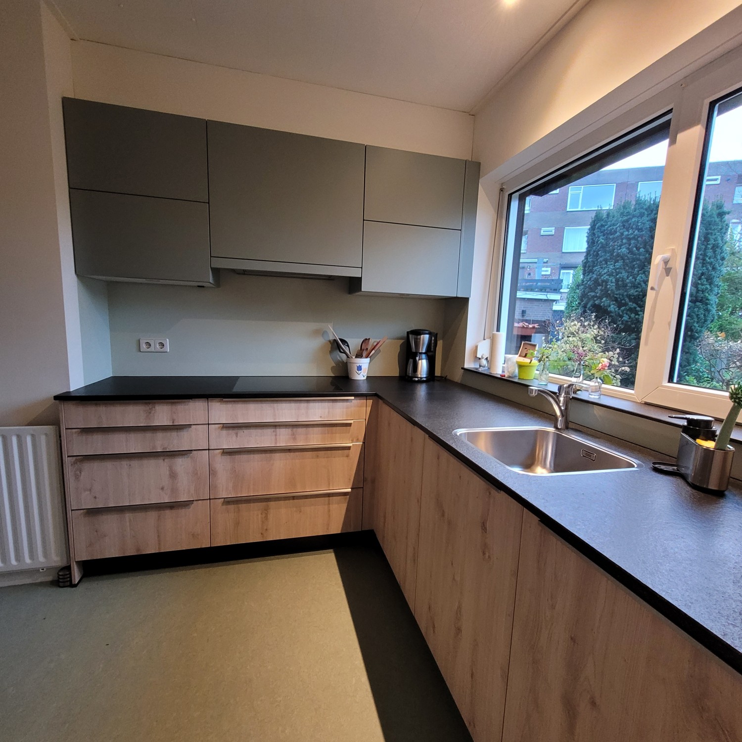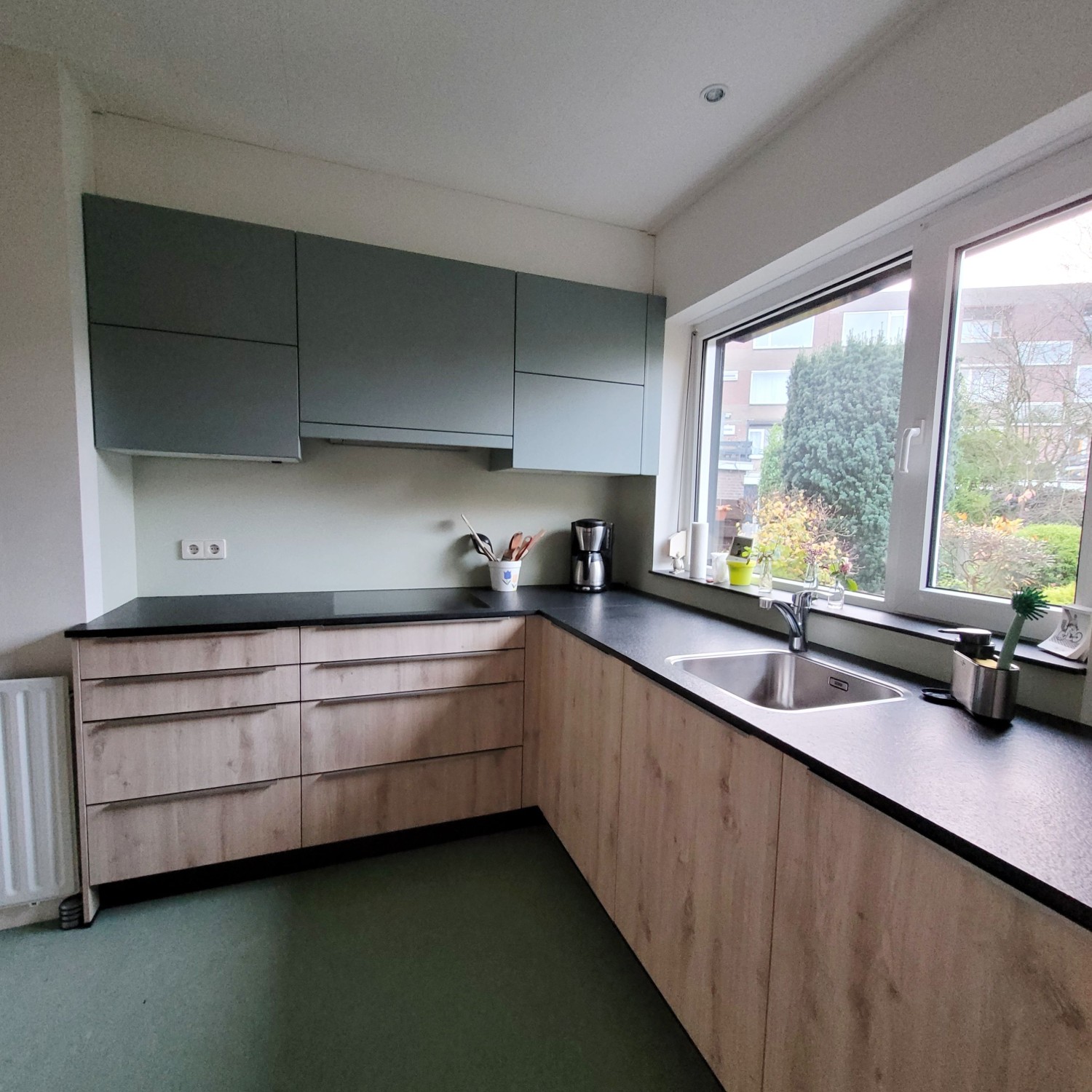 Die matten grünen Oberflächen der Oberschränke mit Türen, die nach oben öffnen sind super sauber zu halten. Das Holzimitat auf den Unterschränken und dem Kühl-Gefrier- und Ofenschrank ja sowieso. Für die Rückwand hinter dem Herd haben wir eine Spezialfarbe in einem Grünton in der Farbenfabrik hier in der Stadt mischen lassen. Sie musste vier Wochen durchtrocknen, ist nun gut und einfach sauber zu halten. Auch der grüne Linoleumboden von Forbo ist leicht in der Pflege.