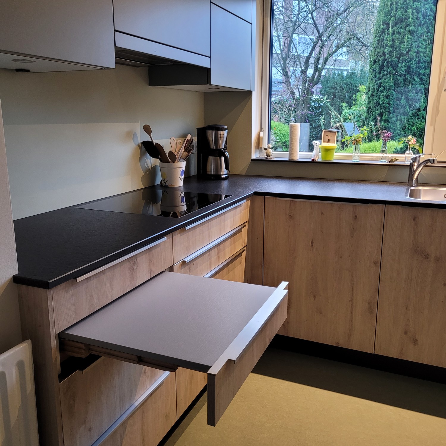 Die Arbeitshöhe ist mit 94cm gut für meinen Mann, für mich ist das zwar etwas hoch, aber der Ausziehtisch hat für mich die optimale Höhe fürs Rühren, Kneten oder Brot schneiden. Tolle Sache! Der Neff-Ofen kam im zweiten Anlauf intakt an, der Einzug der Tür ist der absolute Hit. Muss mich noch gewöhnen, dass ich nicht mehr mit Heißluft backen kann (außer mehrere Bleche Kekse). Auch kommen wir noch nicht so smooth mit der Induktionsplatte zurecht, erstaunlich wie die Leistung einer Platte erst einmal nachlässt, wenn zwei andere hinzugeschaltet werden. Das kommt dann wieder gut, braucht aber einen Moment.