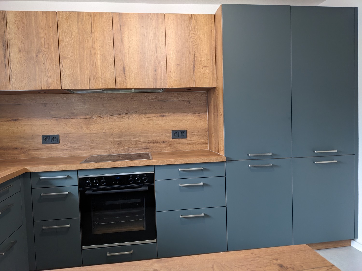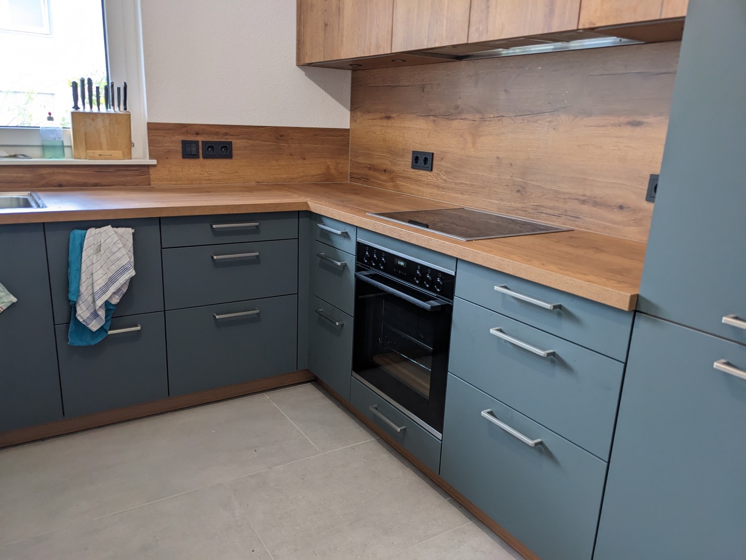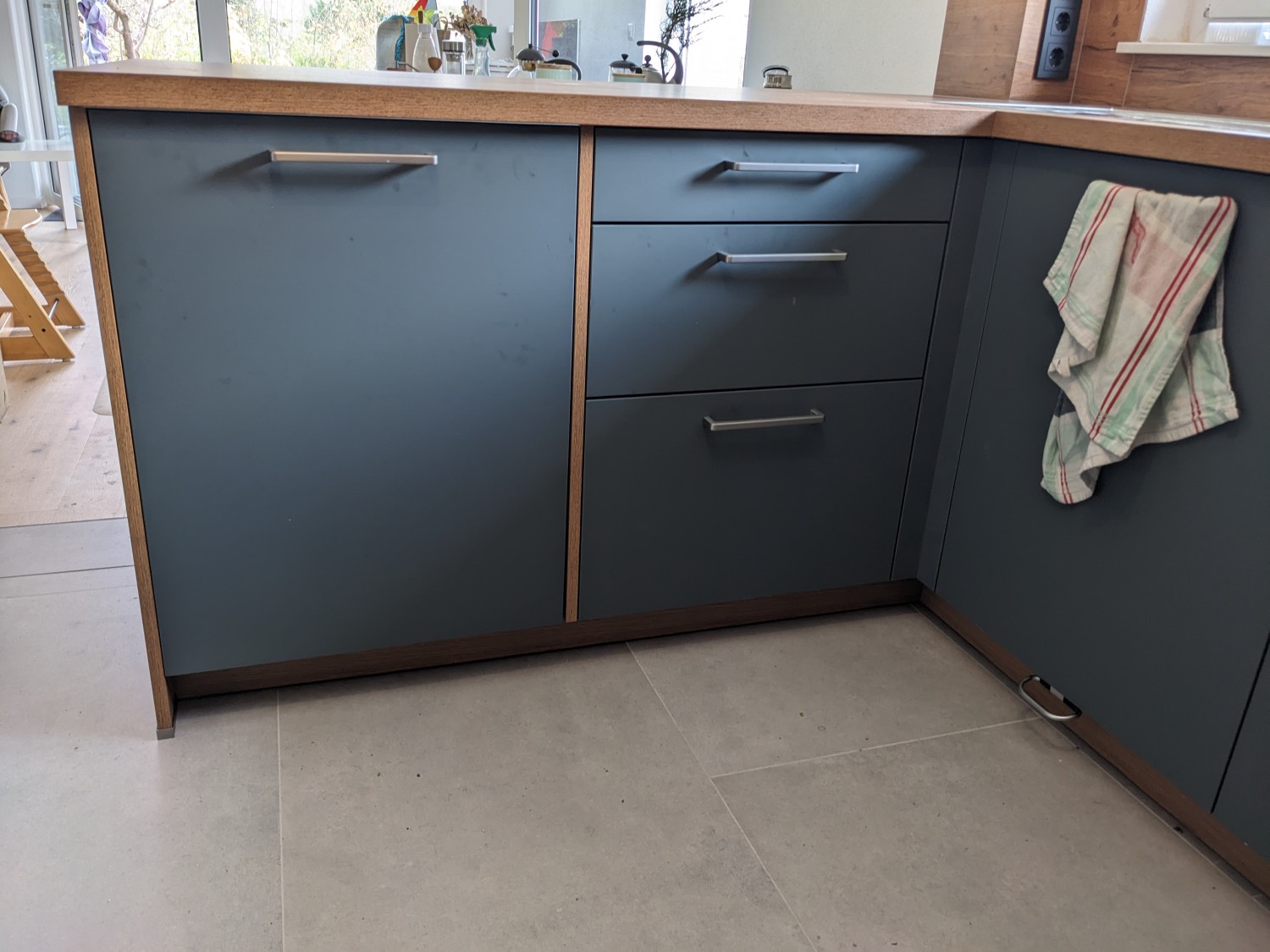 Außerdem sind wir auch sehr zufrieden mit unserer Fronten-Wahl. Der grünliche "Sencha" Ton wirkt je nach Wetter und Tageszeit mal grünlicher, mal bläulicher und passt wunderbar zu dem warmen Holzton. Dafür haben wir schon viele Komplimente bekommen. Auch die "nano" Oberfläche hält was sie verspricht und man sieht keine Fingerabdrücke.