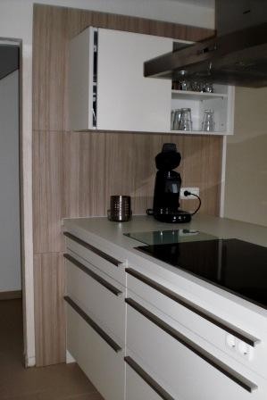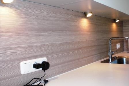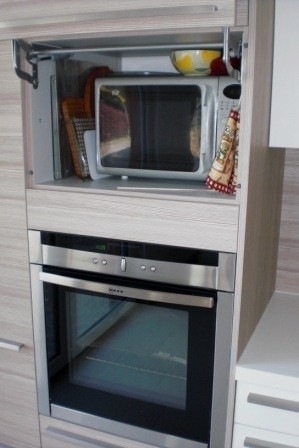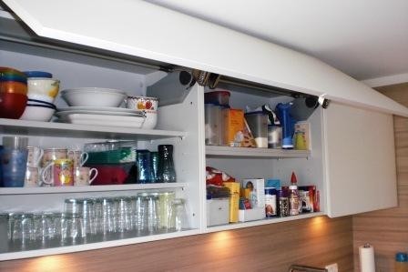 Die Schwingklappenoberschränke sind super, bieten sehr viel Platz und sind vom Handling her sehr toll. Sie haben eine Schrägkante da auch grifflos.