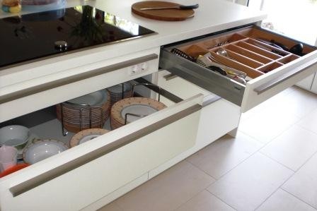 Wir sind grundsätzlich sehr zufrieden im täglichen Gebrauch und es ist auch alles sehr anwenderfreundlich angeordent. Wir kommen also sehr gut zurecht. Die Schubladen/Schränke bieten sehr viel Platz, der auch tatsächlich noch nicht ausgenutzt ist. Dies liegt wohl auch daran, dass wir direkt nebenan einen HWR haben, wo sowohl die Vorratshaltung wie auch die Unterbringung von größeren Küchenmaschinen ist.