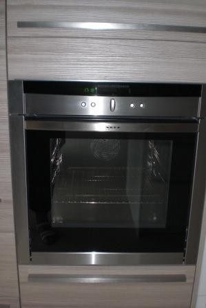 Der Backofen hat diese Slide&Hide-Tür, die beim Öffnen ganz unter dem Backofen verschwinden kann. Das ist auch ne tolle Sache, die wir jetzt schon sehr lieben, weil somit niemals die Tür im Wege steht.