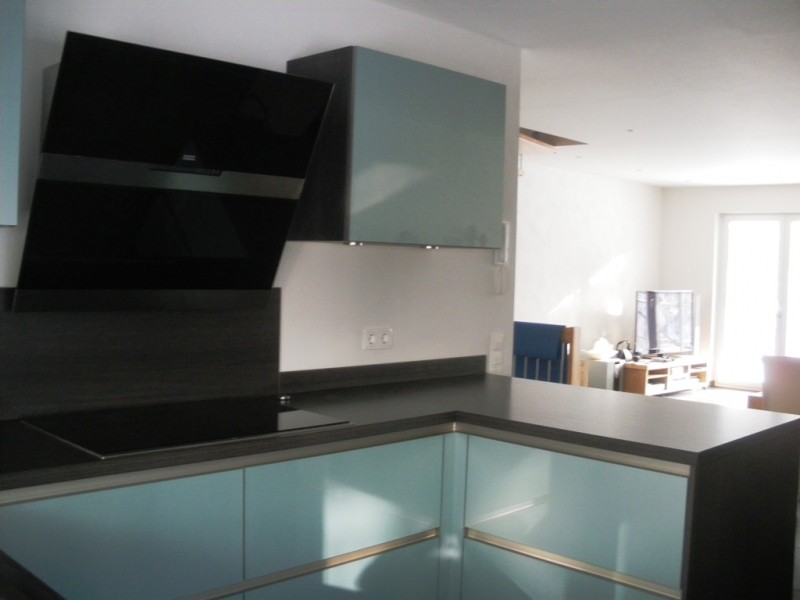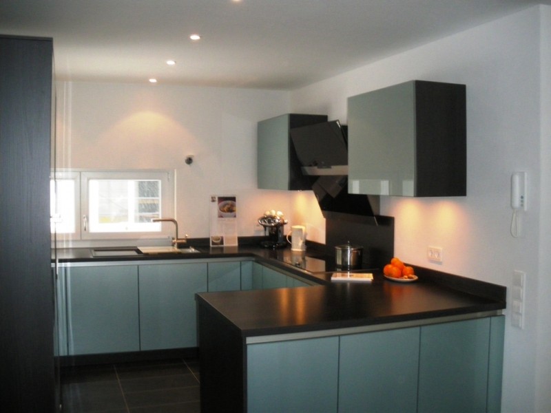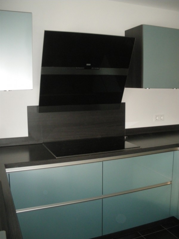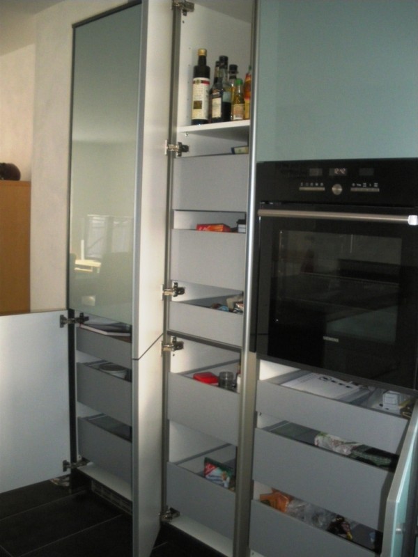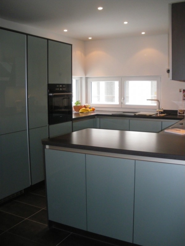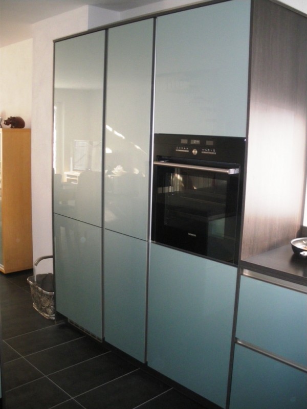 Die Frontfarbe haben wir gewählt, da unsere letzte Küche weiß hochglanz war, und es diesmal eine andere Frontfarbe sein sollte. Lange Zeit hatten wir aber keine Alternative gefunden, bis wir über Schüllers aqua metallic gestolpert sind. Zum Glück konnten wir die Front in der Nähe in Natura sehen und danach waren wir uns sicher. mM nach eine tolle Optik, die Front wirkt in Kombination mit der Korpus-/Arbeitsplattenfarbe toll, undman sieht sie bestimmt auch nicht an jeder Ecke ;-)