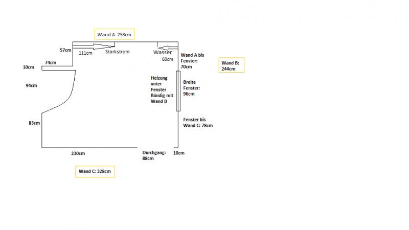 Zu den Gegebenheiten: Die Wohnung befindet sich im Eigenhaus meines Großvaters. Kleinere Umbauten stellen keine Probleme dar. Zur besseren Übersicht habe ich die für die Küchenplanung relevanten Wände mit A, B und C benannt. In meiner jetzigen Planung wäre auch eine Verlegung des Wasseranschlusses auf Wand B, sowie eine Verlegung eines abgesicherten Stromanschlusses in Wand C und eine Verlegung der Heizung von "unter dem Fenster" zur 78cm breiten Wand Richtung Durchgang eingeplant. Aktuell ist die Heizung unter dem Fenster in einer Niesche endet bündig mit der Wand. Abluft ist in Planung. Der Mauerdurchbruch müsste dann in Wand B sein, da dies die einzige Außenwand ist. Zusätzlich zur Küche befindet sich ein Vorratsschrank im Flur.