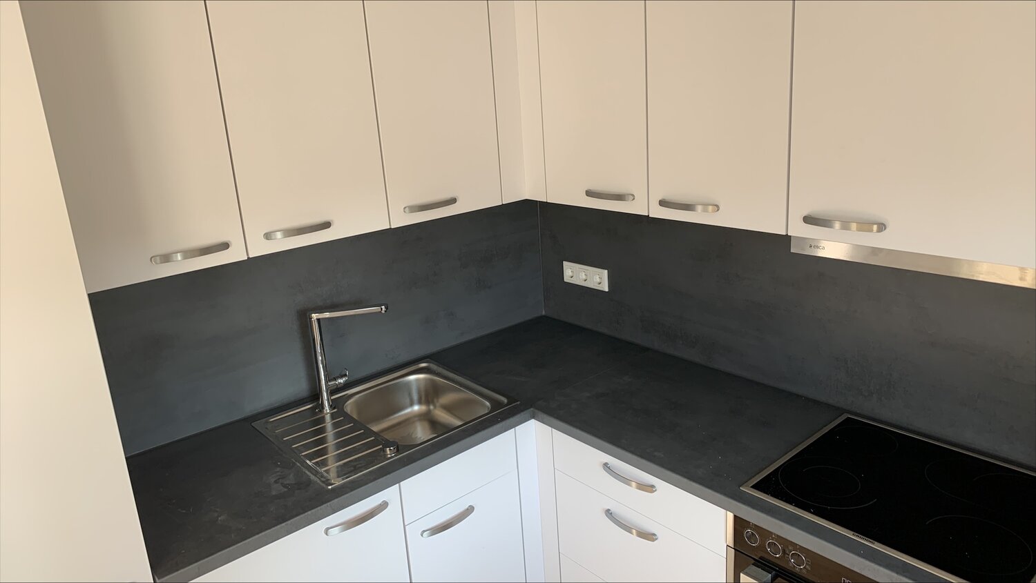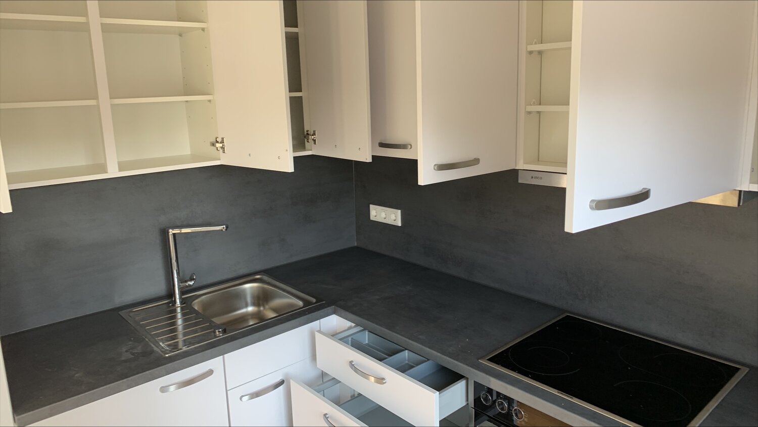 Stell das Ding ans Fenster. Sonst kommst du, wenns offen ist, nicht an Spüle und Müll, um Reste zu entsorgen. Und für die Arbeitsflächenaufteilung ists auch besser.