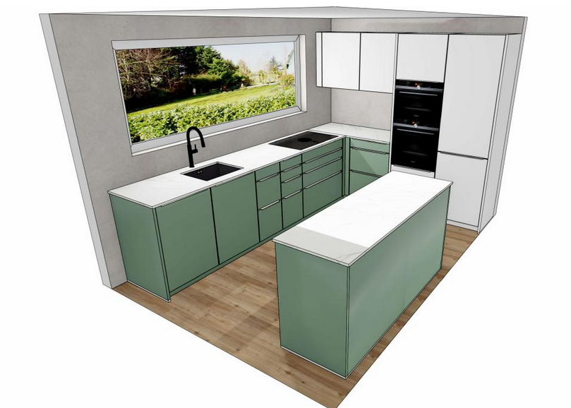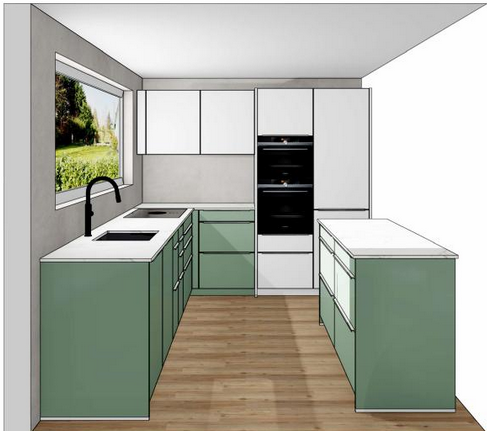 - Arbeitsinsel ist aktuell 60cm tief - mit einer Tiefe von 70cm wäre Übertiefe möglich, aber nur mit einem 78er Korpus. In der Zeile gegenüber macht jedoch der 84.5cm Korpus wesentlich mehr Sinn, da kaum Übertiefe realisierbar ist. Was denkt ihr, würde das komisch aussehen, wenn die Sockelhöhe bei der Insel anders ist als bei der Zeile? Zeilenabstand bei 70cm ist etwa 105-110cm