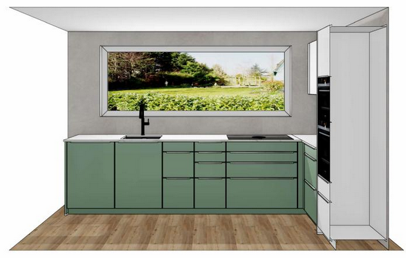 Seitenschränke: Oberhalb der OS/HS läuft es wohl auf die Entscheidung Deckenhaube oder Muldenlüfter hinaus. Falls Muldenlüfter, wäre dann unser aktueller Trend zu nicht deckenhoch und mit einem versteckten LED Band arbeiten. Trockenbau eher nicht, lieber ein paar cm mehr AP.