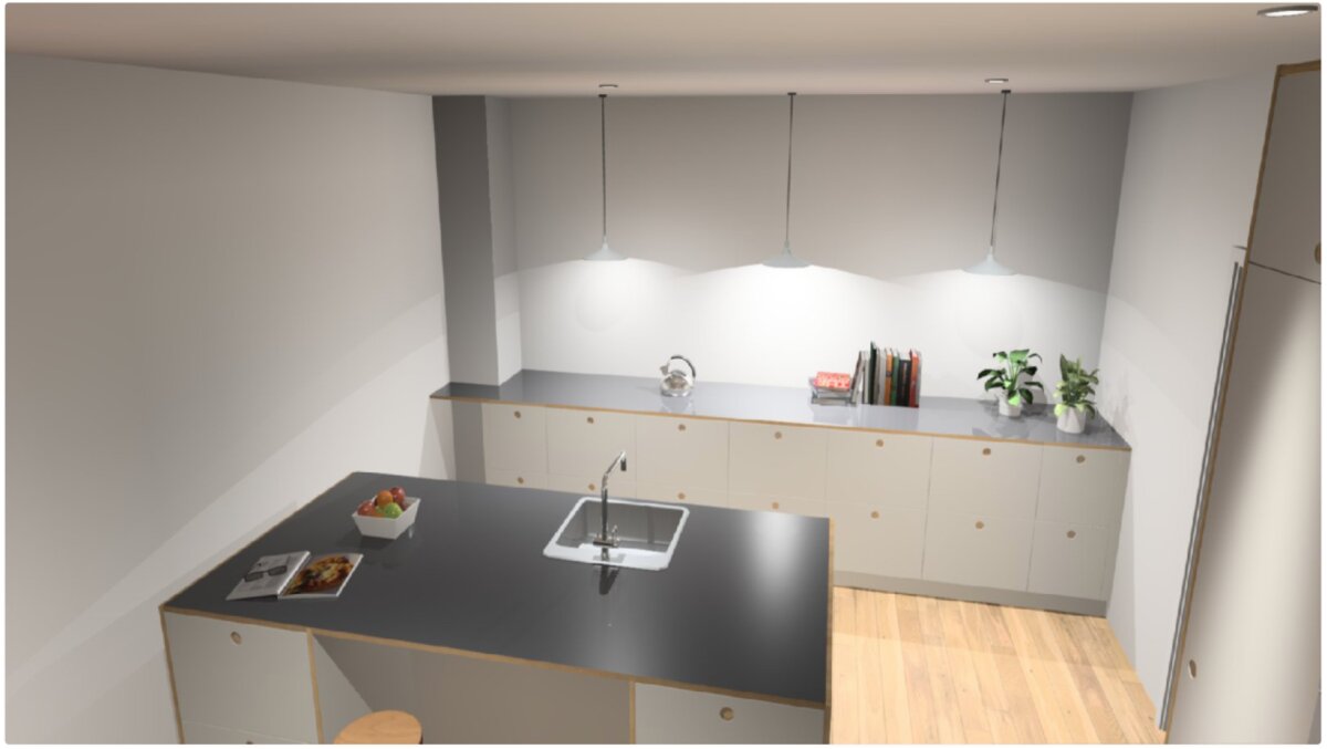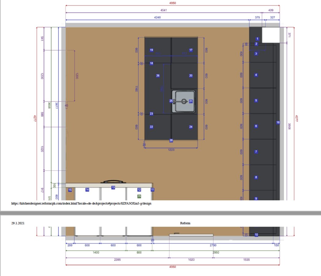 Die Küche ist bereits bestellt, aber ohne Elektrogeräte. Daher ist das Kochfeld in den Bildern nicht zu sehen. Es soll gegenüber der Spüle über die beiden 60er-Unterschränke 3 & 4 aufgesetzt werden. Die Korpusse haben wir von IKEA gekauft, die Fronten (Linoleum) sowie die Arbeitsplatte (Spannplatte mit FENIX -Beschichtung) werden von Reform Cph. geliefert. Leider stand die finale Planung nicht, als die Sole gegossen wurde. Sonst hätten wir das Rohr für die Abluft besser positioniert. (Es läuft innerhalb der Sohle nach draußen und kommt der hoch.)
