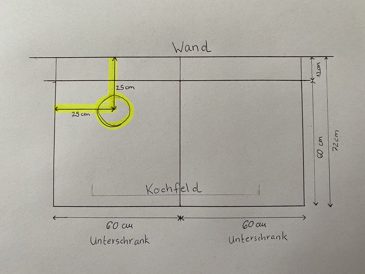 Die Sockelhöhe beträgt 11 cm. Die Arbeitsplatte ist tiefer als die Unterschränke, sodass sich zwischen Schrank und Wand ebenfalls 11 cm Platz ergeben. Bis vor kurzem dachte ich, das wäre genug Raum für die Abluft. Hatte mir aber keine Gedanken über Winkel etc gemacht.