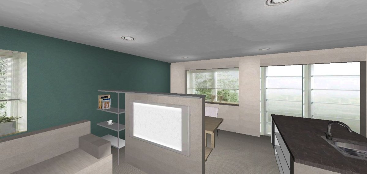 Die Trennwand Essen/Wohnen: wir haben uns überlegt, sie nun sogar deckenhoch zu ziehen. Mehrere Gründe:
