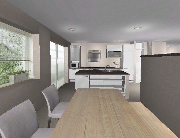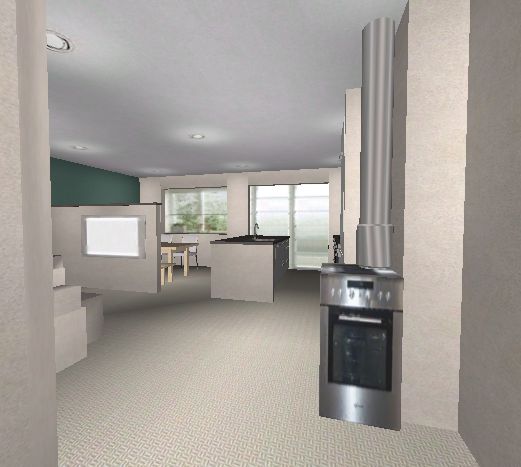 Ich denke, du wirst im Wohnzimmereingangsbereich sehr eng. Der Kamin erscheint mir unrealistisch klein. Du mußt ja berücksichtigen, dass auch noch ein Kaminschacht dazukommt. Die Kücheninsel wird auch immer länger ;-)