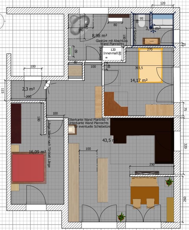 Die Dusche können wir noch 10 cm breiter machen, das geht mit den Wänden Bad Planunten, ich dachte, das 80 ein "Standard" ist.