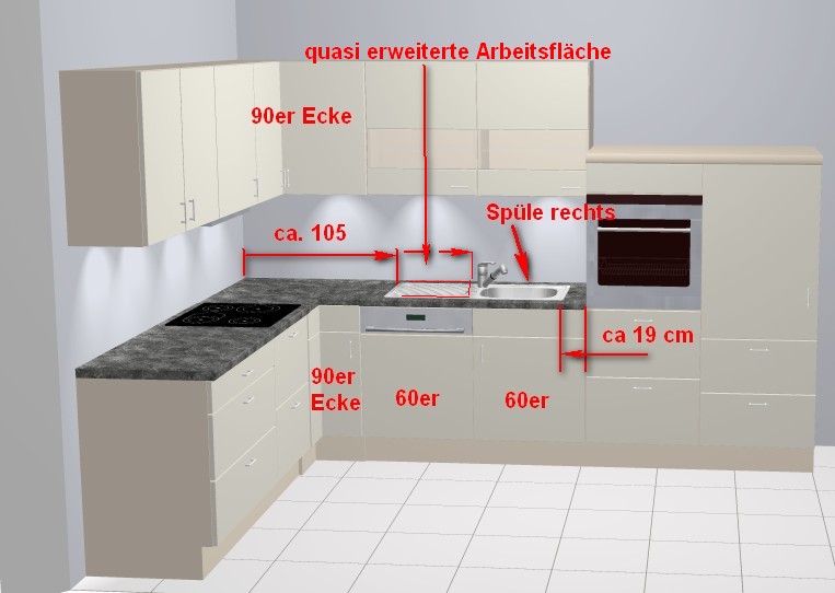 .. ich würde das Kochfeld bis auf 40cm an den linken Rand schieben, nach der toten Ecke einen U-Schrank, dann Spüle (ohne Abtropfe) ganz nach rechts gesetzt im Unterschrank , dann der GSP.