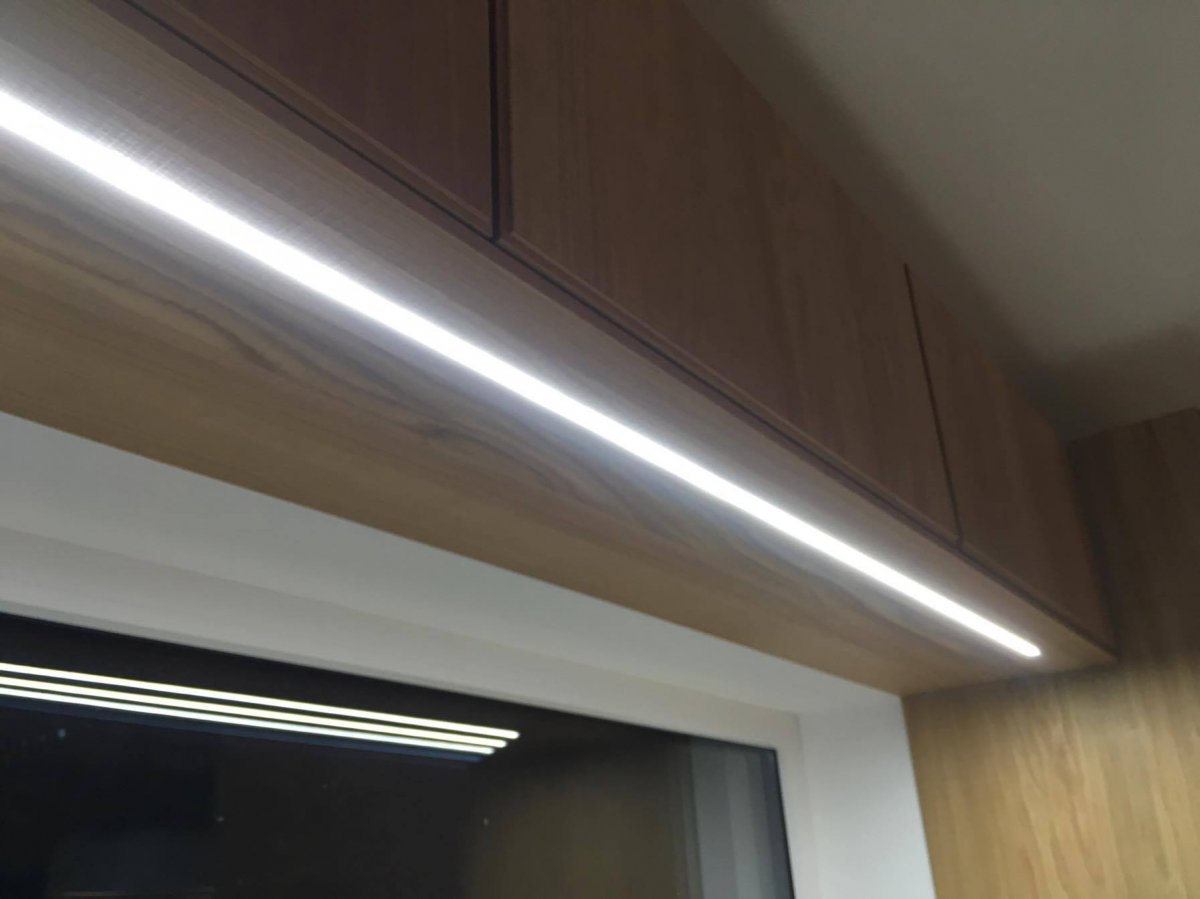 Verwendet habe ich einen LED-Stripe mit 20W/m bzw. 1760lm/m. Da das eingefräste Aluprofil ja in der Wärmeabfuhr behindert ist, werde ich noch eine Temperaturabschaltung verbauen.
