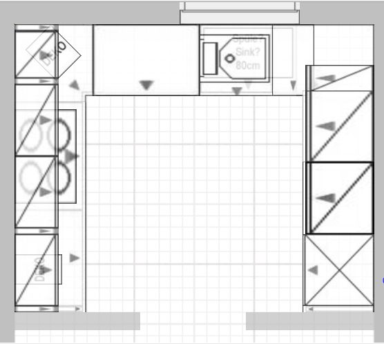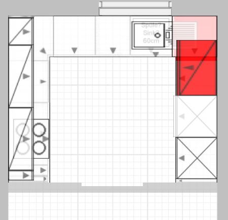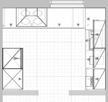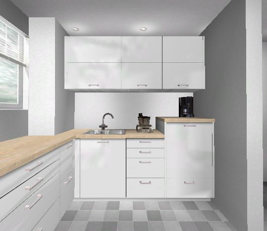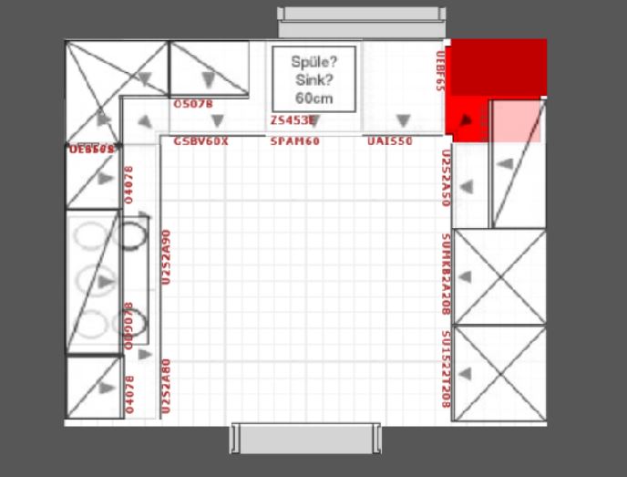 Ansonsten würde ich noch etwas ändern und die Oberschränke nicht um die Ecke ziehen. An den Eckhängeschrank kommt man nur mäßig gut, der wird dann zum "Dinge- die-man-selten-benutzt-Grab". Statt der zwei schmalen OS rechts und links von der Ecke dann einen weiteren viel besser zu nutzenden und zu bestückenden breiten OS.