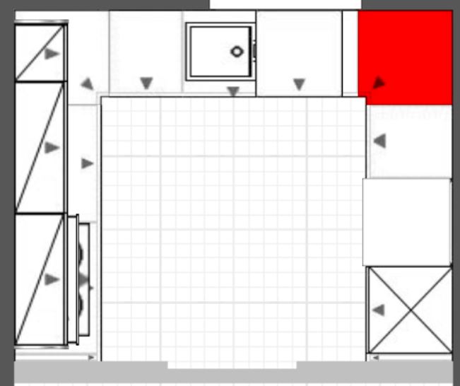 • Bis zum Schacht dann eine ca. 20 bis 22 cm breite Drehtürfront hinter der nur 1 oder 2 Fachbretter sind. Da kann man ganz unten ein schmales Gerät einstellen und im nächsten Brett nicht benötigte Backbleche etc. senkrecht einstellen.