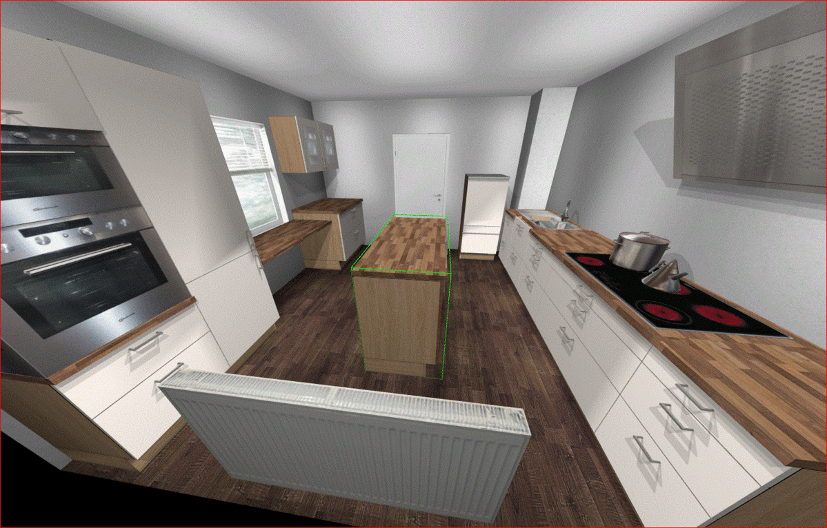 Ich ziehe in Erwägung, die Arbeitsplatte auf der planrechten Seite ggf. mit einer Tiefe von 90 cm zu versehen, damit ich sie immer noch vollumfänglich nutzen kann, auch wenn hinten an der Wand die Elektrogeräte stehen.
