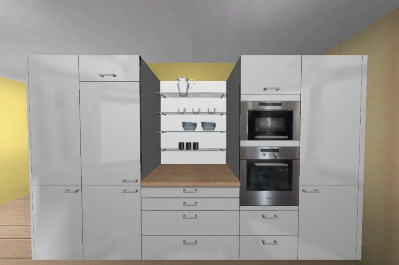 Tablare und Bleche könntest du unter dem BO unterbringen, entweder in den Auszügen, oder du machst dort eine Drehtür mit vertikalen Unterteilungen (guck dazu mal bei Nice-Nofret in die Küche) und stellst die Tablare/Bleche dort hinein.