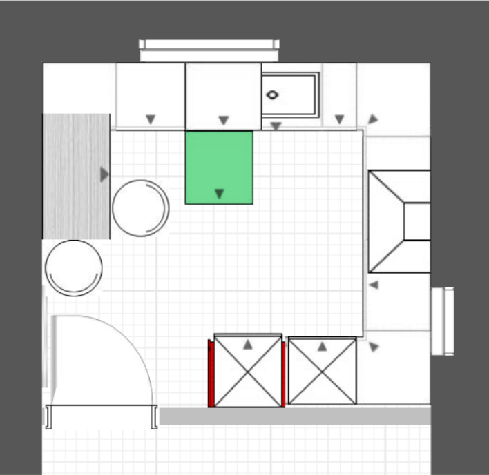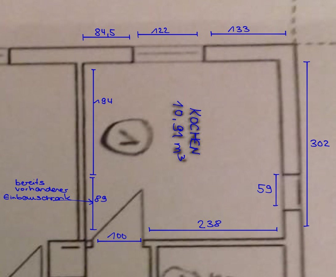 Wir planen in unseren Altbau nach Renovierung eine neue Küche einzubauen. Wir sind ziemlich ratlos und kommen über den unten gezeigten Planungsversuch leider nicht hinaus.
