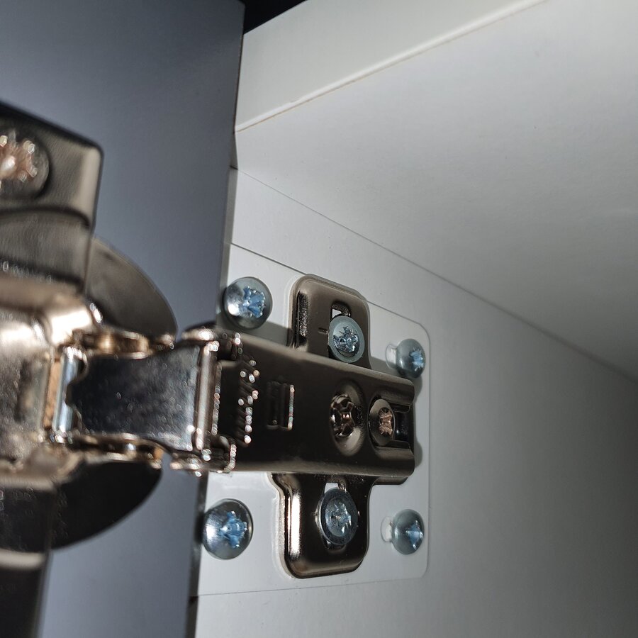 - um den Kühlschrank nicht leer räumen und aus dem Faktumschrank rausnehmen zu müssen, habe ich jeweils die vier Schrauben eines alten Scharnieres verwendet, so dass ich keine neuen Bohrungen für die neue Schraubbefestigung eines neuen Scharniers in Schrankwand und Deckblatttür vornehmen musste.