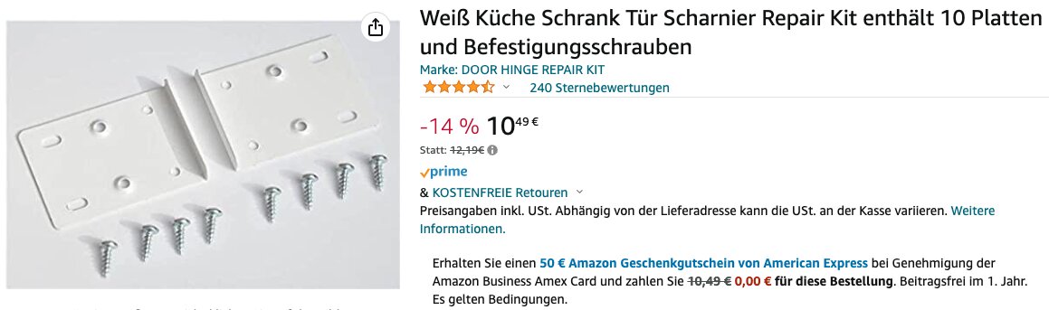 nachdem ich mir beim Schreiner in meinem Wohnort ein Angebot eingeholt hatte und dieser sage und schreibe 420 Euro für den Austausch der defekten Blum Scharniere für einen fast 20 Jahre alten Ikea -Küchenschrank wollte, habe ich weiter recherchiert und diese Scharniere hier gefunden - und sie passen wunderbar, selbst für unseren Schrank, wo nur ein schmaler Spalt zwischen Schrank und Kühlschrank bleibt.
