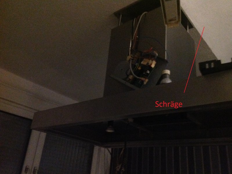 Dort sieht man wo die Schräge anfängt. Ich kann leider nicht mit dem Abluftkanal durch die Decke gehen, da zu wenig Platz vorhanden ist. Selbst wenn es ausreichend wäre, der externe Motor würde nicht rein passen. Auf dem Bild habe ich in rot die Schräge markiert.