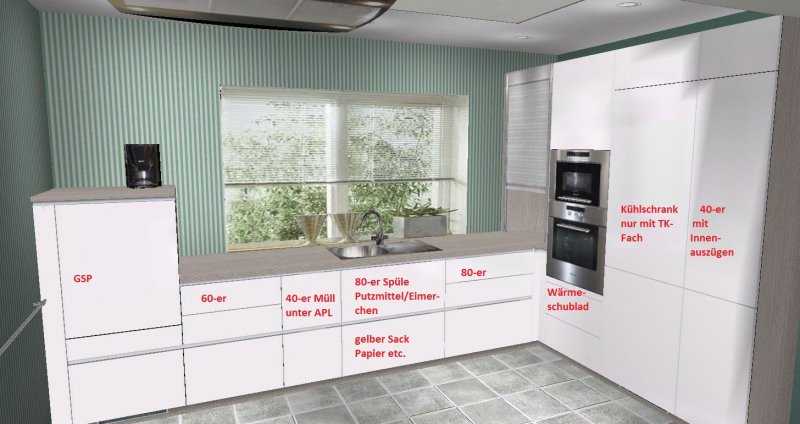 Und ob die Schränke gleich groß sind oder nicht, sieht man weder in einem U noch in einem L + Insel so richtig, so weit kann man innerhalb ja gar nicht zurück treten, um das Gesamtbild zu erkennen, von daher habe ich *nur* auf die eine durchgehende Linie im L geachtet, wobei da beim Backofenschrank wegen der Wärmeschublade geschaut werden muss, in wie weit der Hersteller da was anbietet.