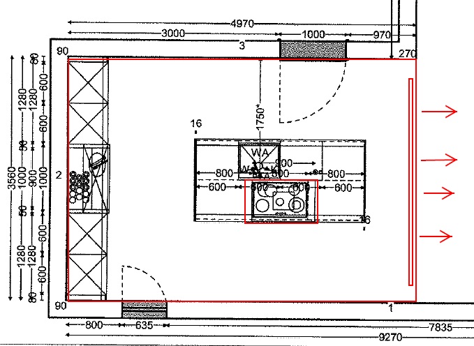 Anbei ein Bild des Grundrisses. Das Rote ist die abgehängte Decke und die DAH und der schmale Schlitz rechts die Ausströmung. So erstmal ein erster Gedankengang.