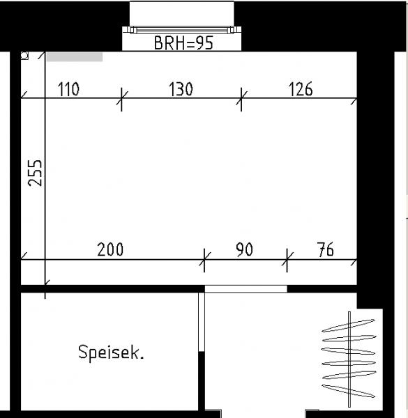 Geplant war eine lange Küchenzeile an die Außenwand, weswegen wir die Heizung unterm Fenster weg gemacht und sie (auf dem Plan) links oben an die Wand gesetzt haben.
