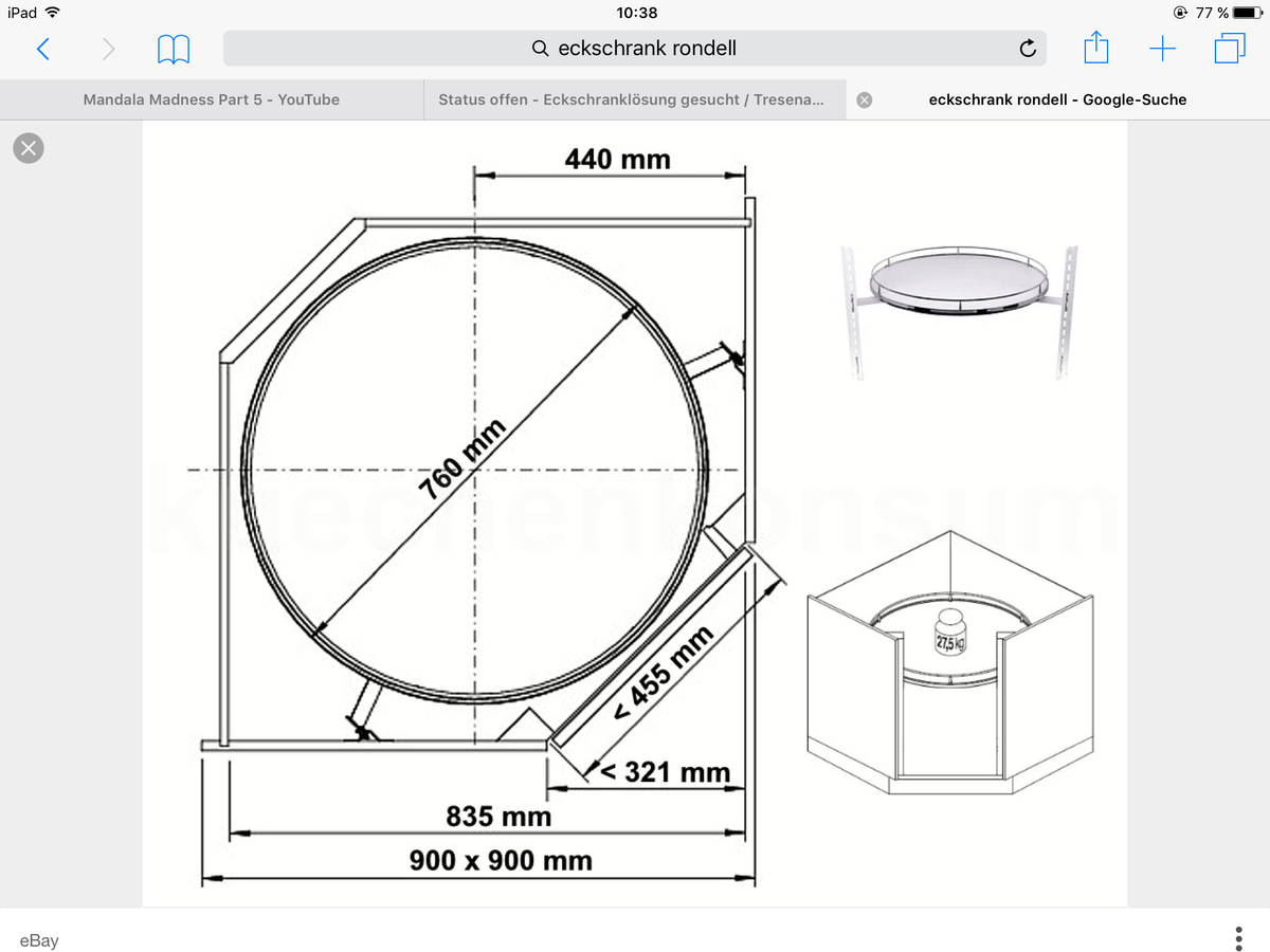 Die Eckschränke sehe ich toleranter ;-) Ich habe letztens eine Küche mit überschnittenen Ecken gesehen, was das Raumgefühl innerhalb des U's schöner gemacht hat (ganz subjektiv meine Meinung) und durch die Form der Ecke war die Tür zu diesem Eckschrank keine Falttür, die finde ich schlimm. Diese Tür hat ca 45cm, was für mein Pötte reicht, und das Rondell dahinter ist ein kompletter Kreis (also zwei, siehe Screenshot). Finde das schon viel Stauraum, ja, man kann sicher ausrechnen, dass anders ein paar qcm mehr rausspringen, aber ich finde die Lösung auch eine wenigstens erwähnenswerte. Allerdings nicht wenn's auf den Euro ankommt, fürchte ich. LG!