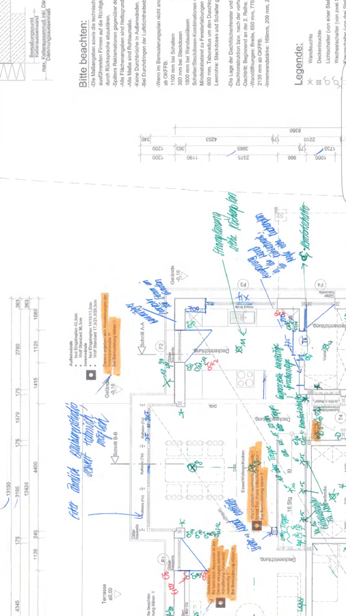 - hier habe ich im Bauplan nochmal die genaue Wandlänge angesehen, da hat sich der Küchenplaner verhauen. Es ist so: Die Wand ist insgesamt 295,5 cm lang. Allerdings muss man eben auch beachten, dass die Wand ja auch 17,5 cm stark ist. Man kann mit den zu versenkenden Schränken also nicht ganz Richtung planunten, sondern kann nur die 278 cm nutzen