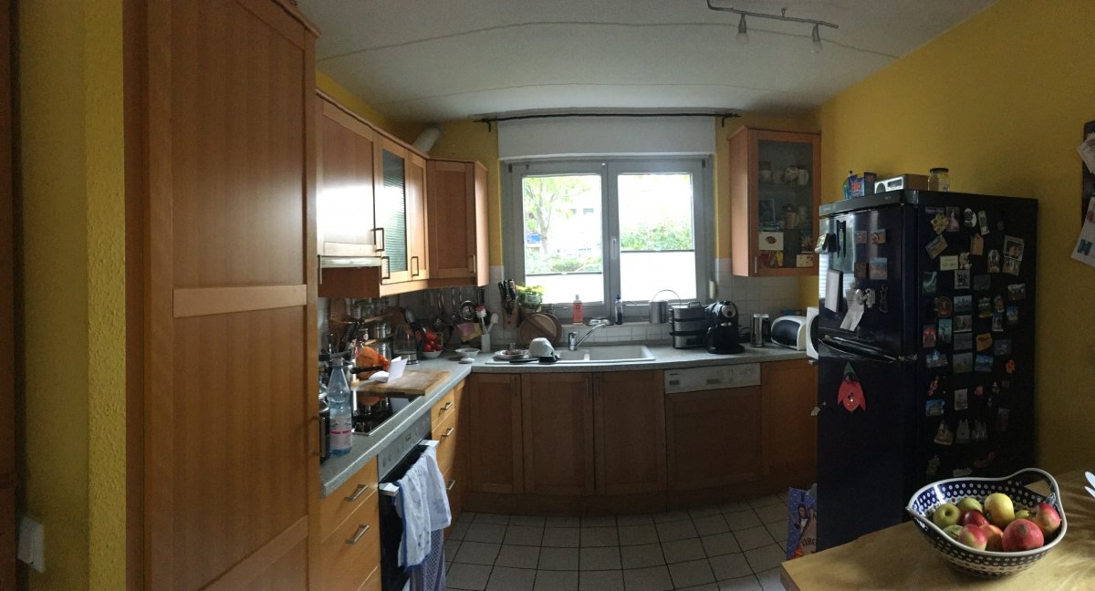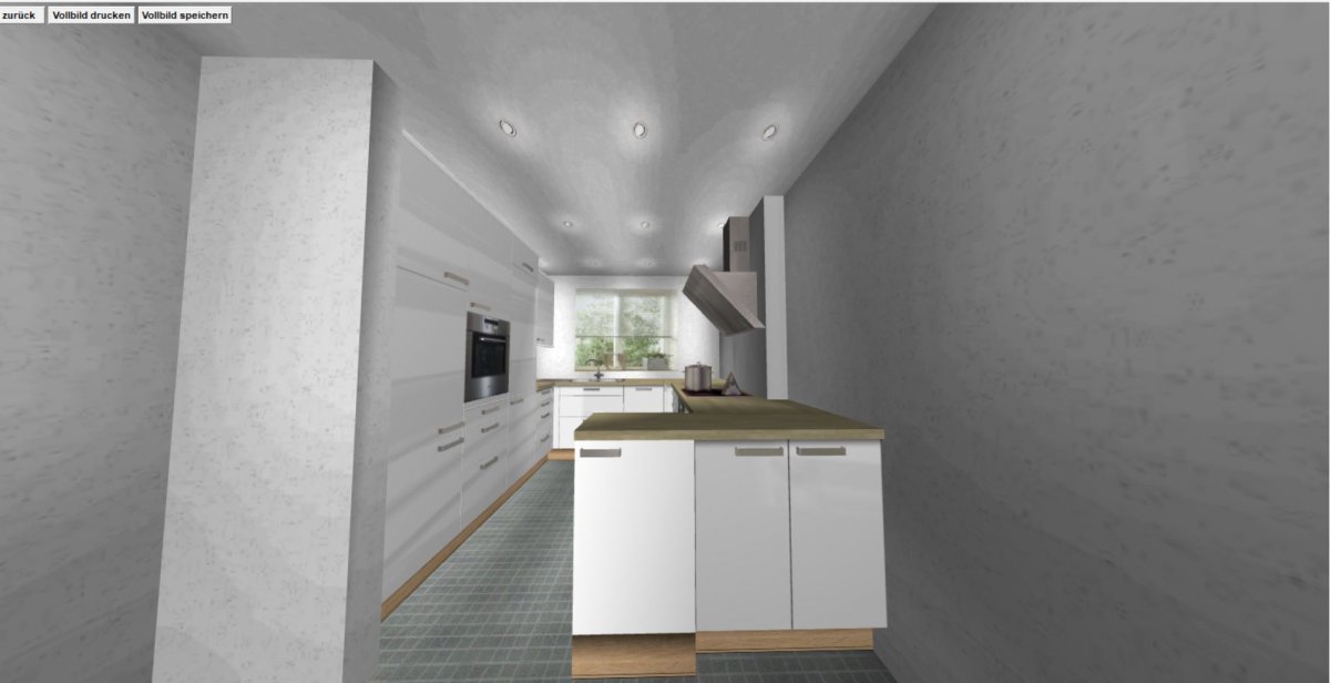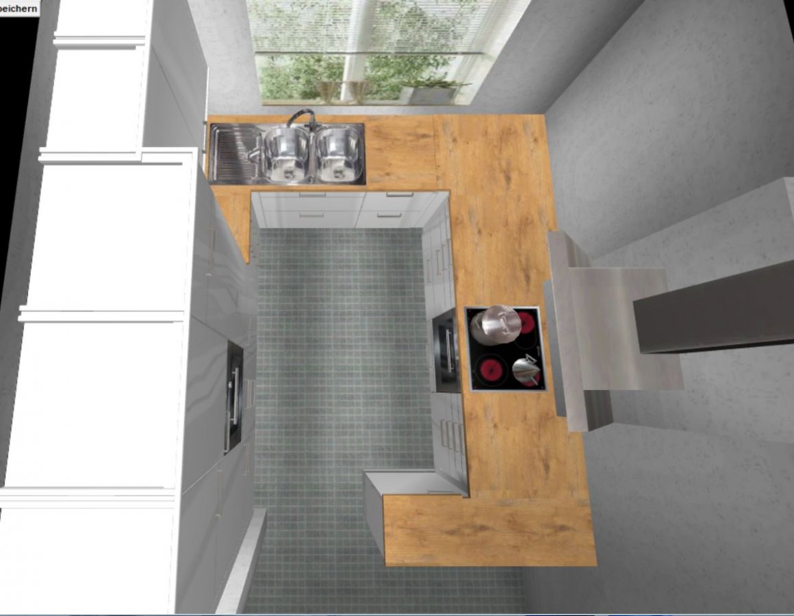 Noch eine Ergänzung: der Herd und das Induktionsfeld (Miele ) sind 6 Monate alt und sollen weiter verwendet werden. Außerdem mal ein Foto der jetzigen Küche. (Und natürlicht gibt es eine Heizung in der Küche: Warmluft mit Bodenauslass in der rechten vorderen Ecke. Da muss dann wohl irgendein Luftkanal bis zur vorderen unteren Abschlussleiste gezogen werden.