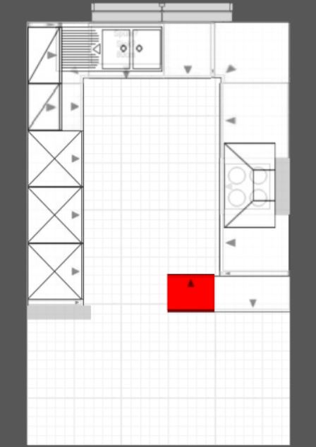 Den Herd habe ich dir nach planrechts gesetzt, da moderne Dunstabzugshauben einen Durchmesser von 15 cm benötigen und deswegen gebohrt werden muss. Dafür hast du eine hochgeestzte GSM.