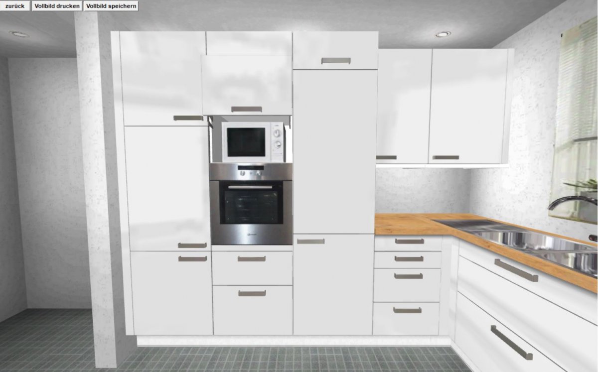 Links die Wand ist mir dagegen zu 'wuchtig' mit drei Hochschränken. Ich hätte die GSM gerne wie gewohnt direkt im Bereich der Spüle. Auch einen Dampfgarer in der Größe brauchen wir nicht (wir haben das kleine Standgerät von WMF, das reicht gut für zwei Personen. Deshalb habe ich mal zwei der Hochschränke durch Ober-/Unterschränke ersetzt, so dass es etwas luftiger wirkt.