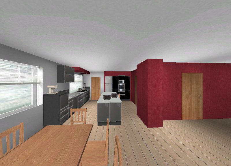 Außerdem haben wir die gesamte Insel etwas nach links gerutscht, damit mehr Platz zur Tür ist, denn Schiebetüren kommen für den Bauherren nicht in Frage.