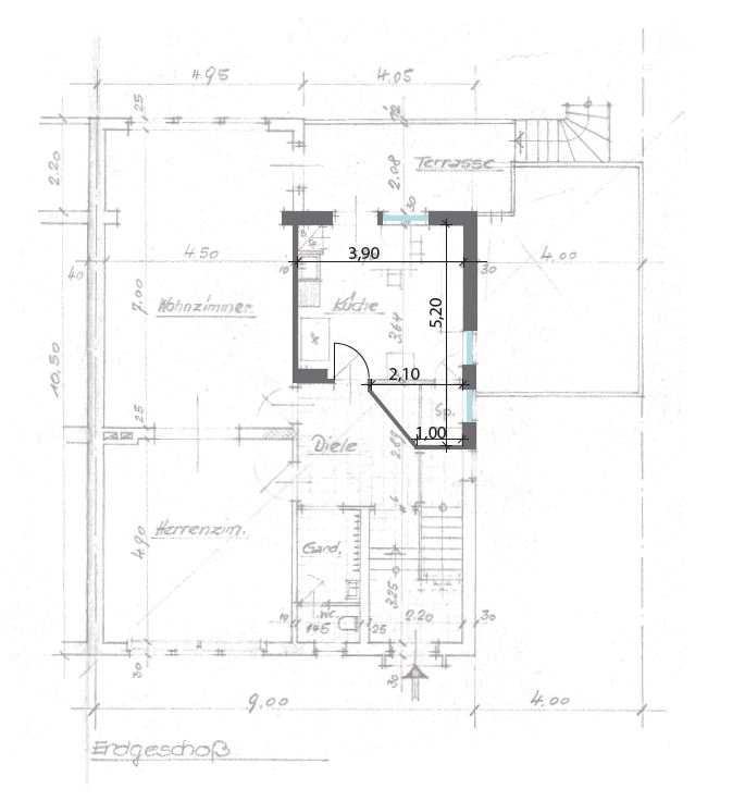 Wir haben das Haus vor sechs Jahren sehr spontan gekauft und die Küche erstmal drin gelassen. Bei der jetzigen Planung mussten wir feststellen, dass sie damals vor 30 Jahren hinsichtlich Raumökonomie ganz schön gut geplant war, was es nicht unbedingt einfacher macht.
