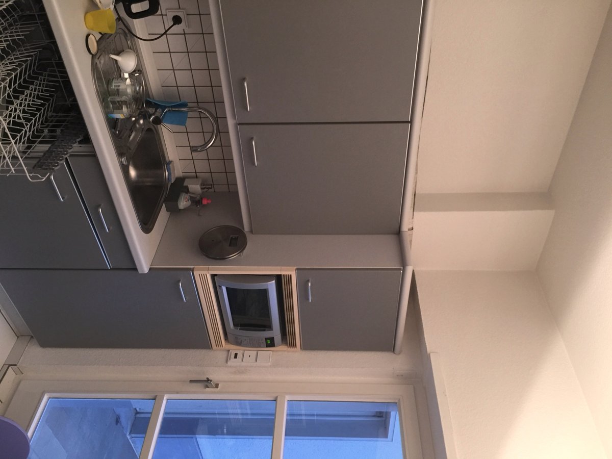 Der Schacht hinter der Mikrowelle geht bis zum Boden, zumindest gehe ich davon aus, die Schränke sind alle verkürzt. Wasser kommt aus der Wand hinter der Spüle, ich habe keine Idee, was sich dahinter verbirgt.