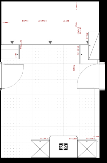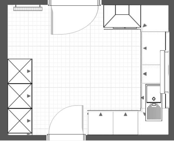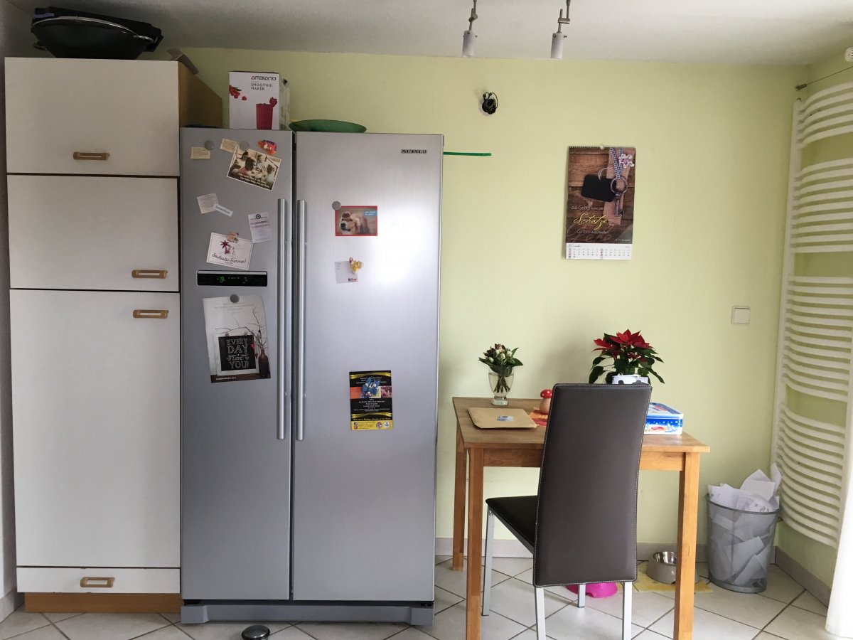 Nur mal kurz ausprobiert - ohne Hochschränke. Einfach nur mal als Überlegung, als Hirngespinst. Optimal ist anders.... Es verursacht auf alle Fälle einen Engpass an der Tür, der MUPL könnte auch nur neben dem KF geplant werden.